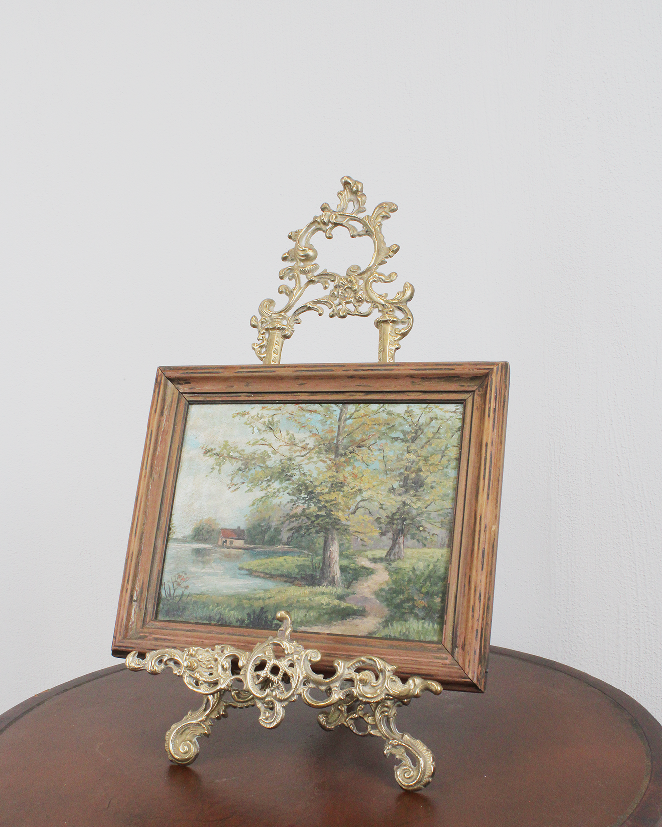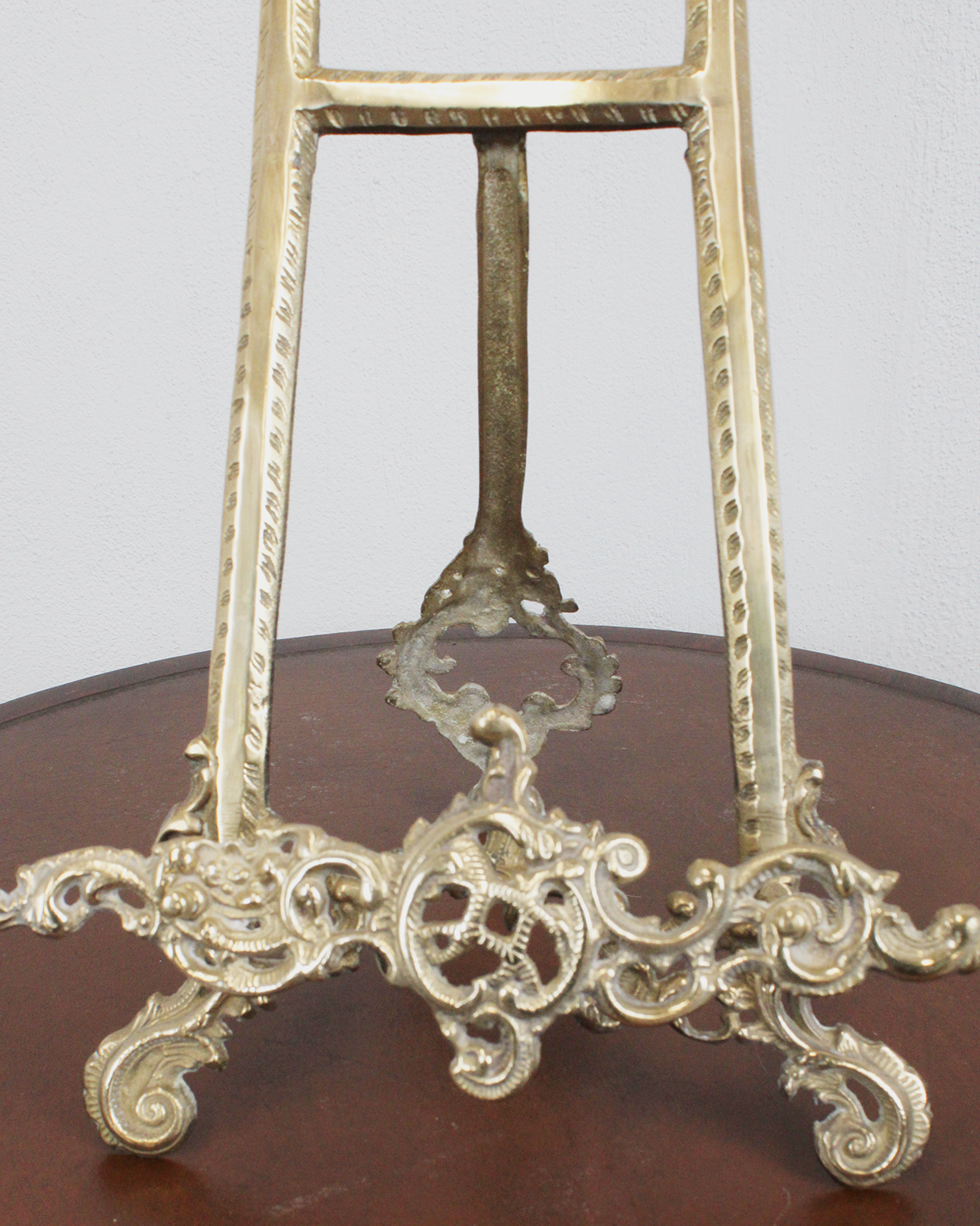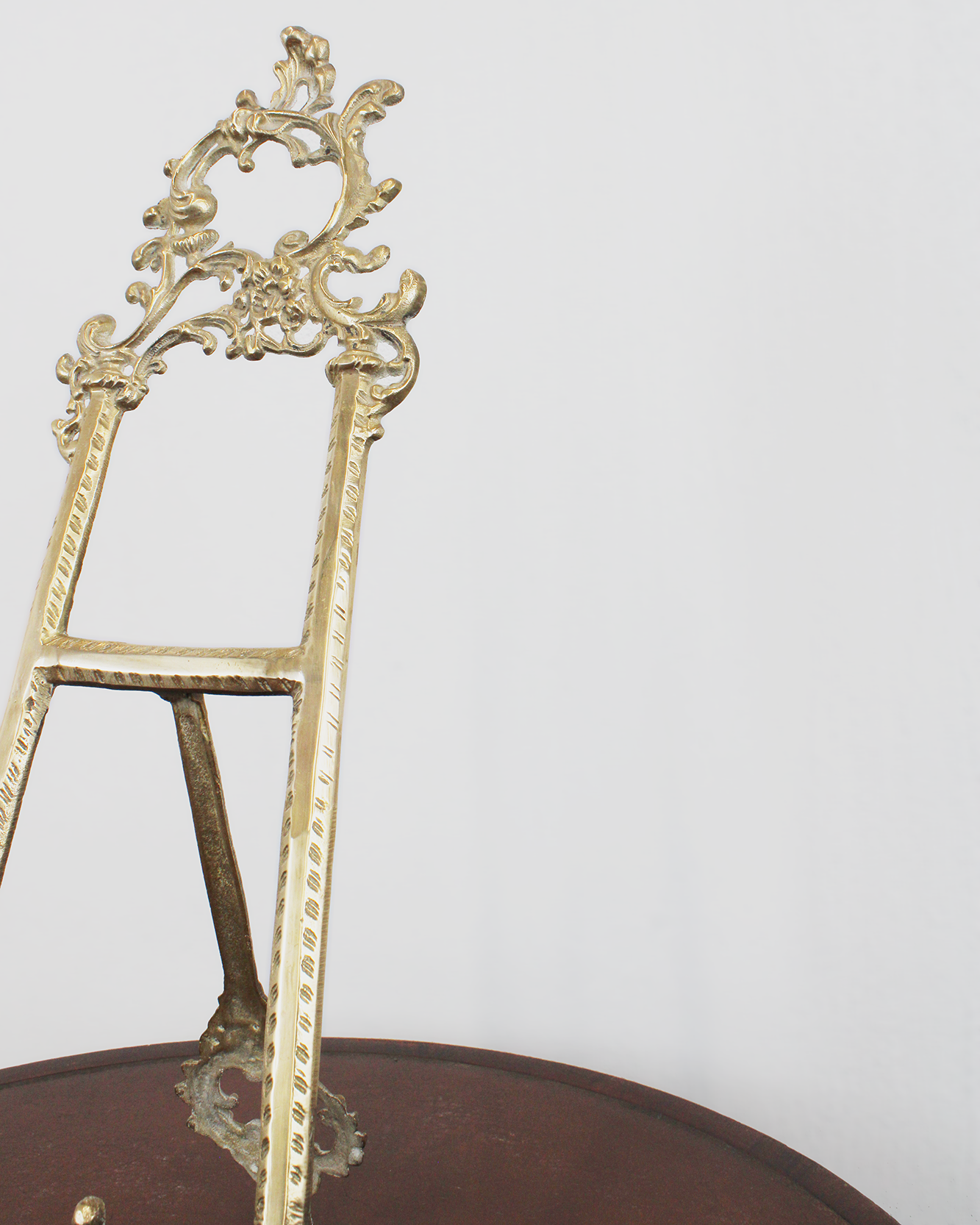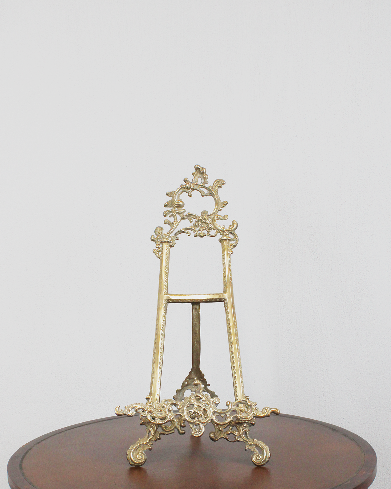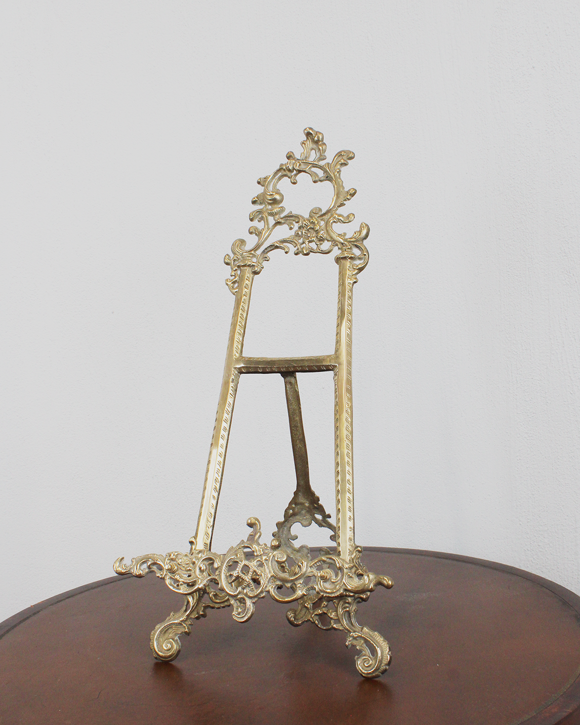 Atril de latón con ornamentación floral y volutas, con estructura sólida y acabado en dorado envejecido. Ideal para exhibir libros, fotografías, o cuadros.