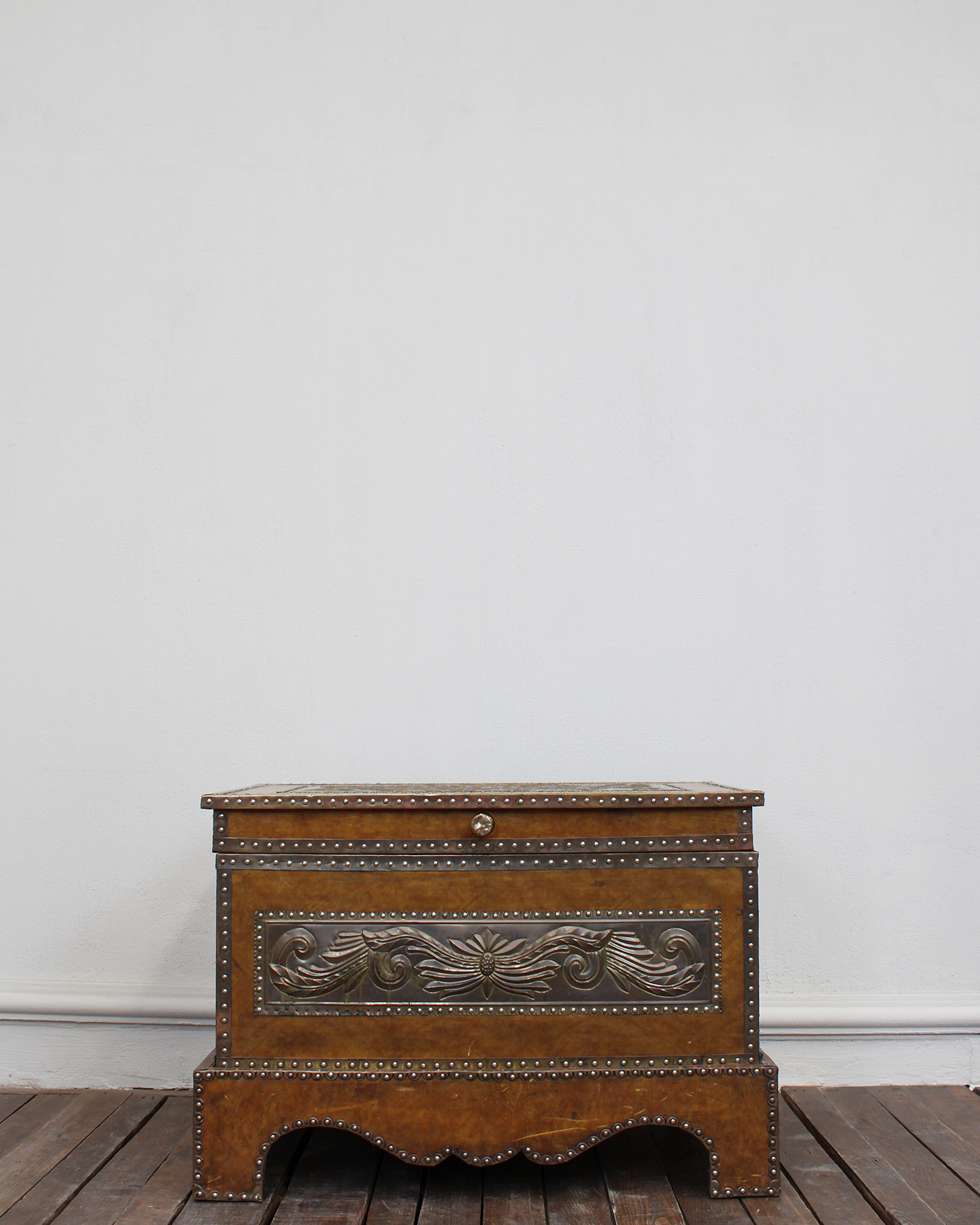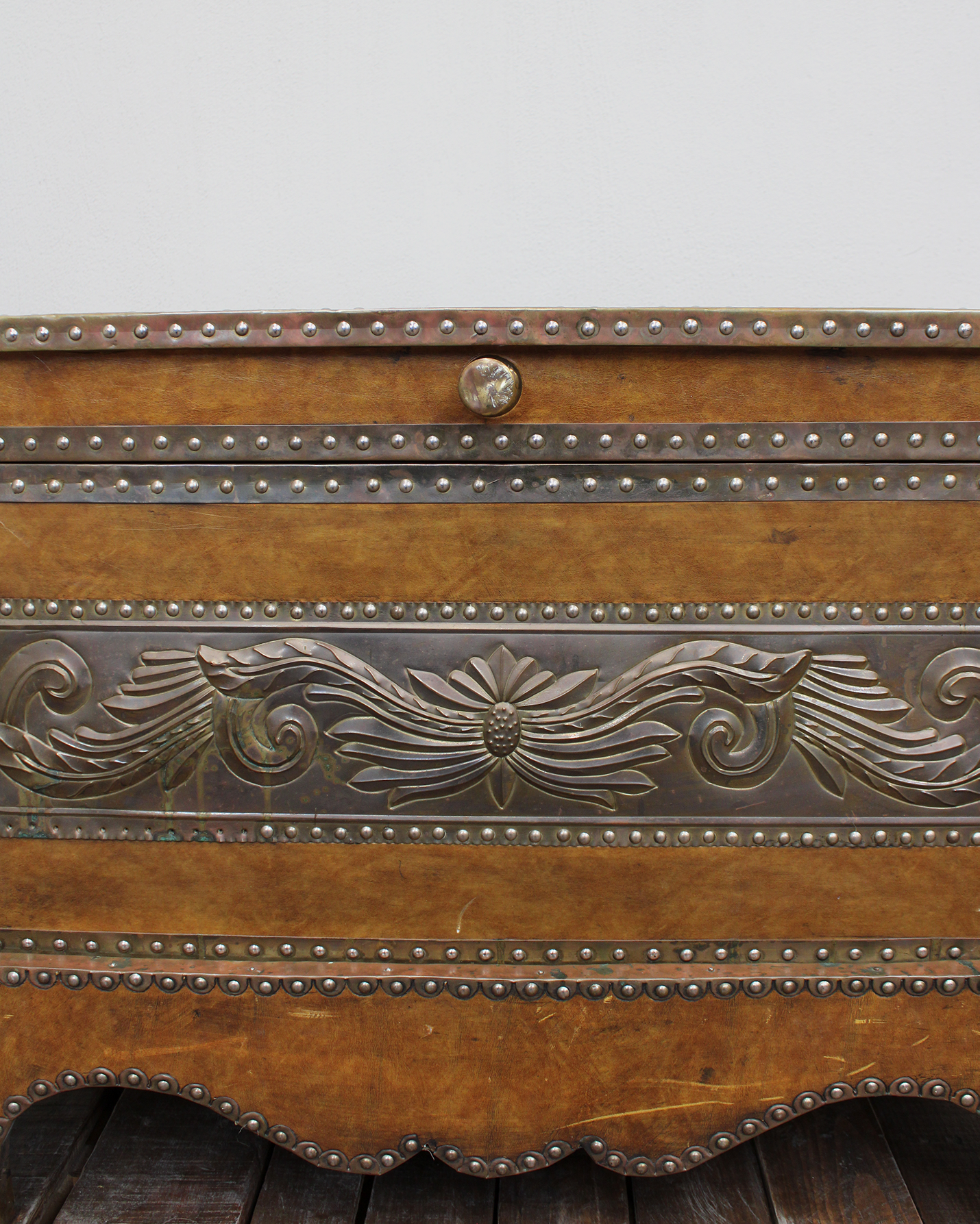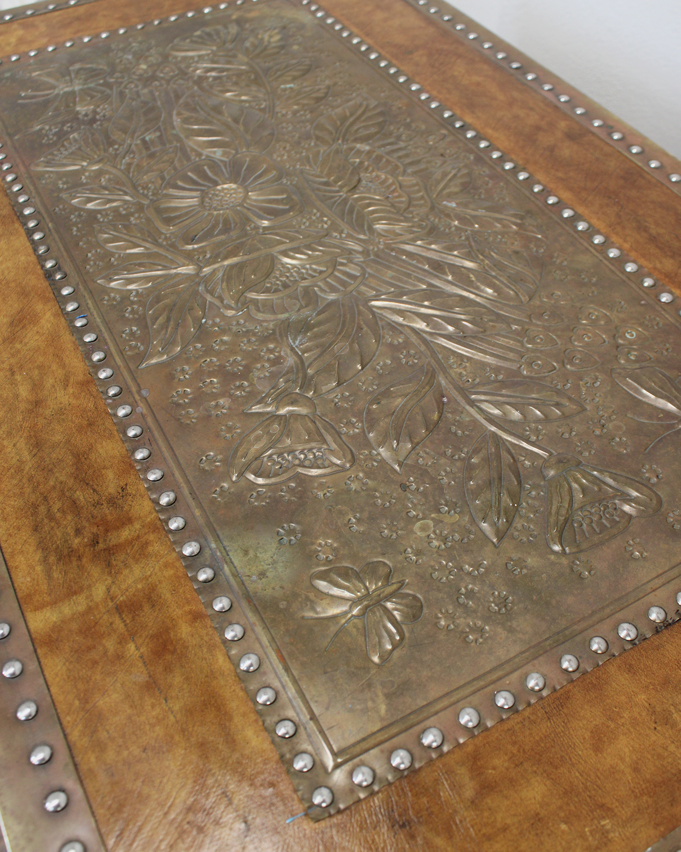 Baúl vintage estilo Colonial forrado en cuero con repujado en lámina metálica plateada con motivos florales y vegetales. Presenta remaches metálicos que enmarcan toda la pieza. Ideal como pieza decorativa, mesa de centro o como baúl de almacenaje.