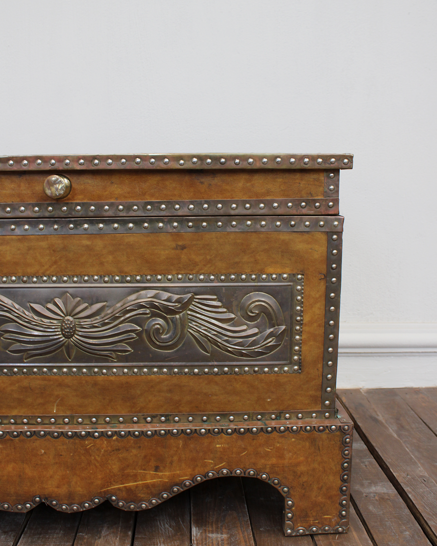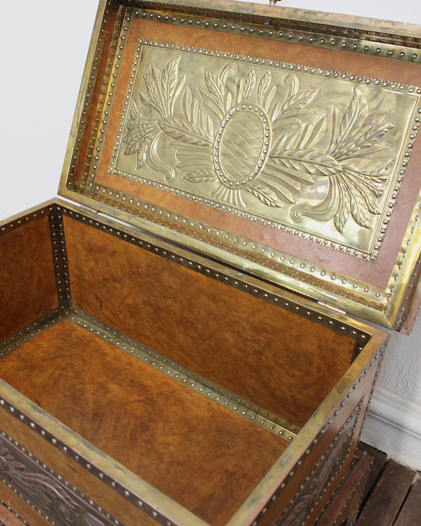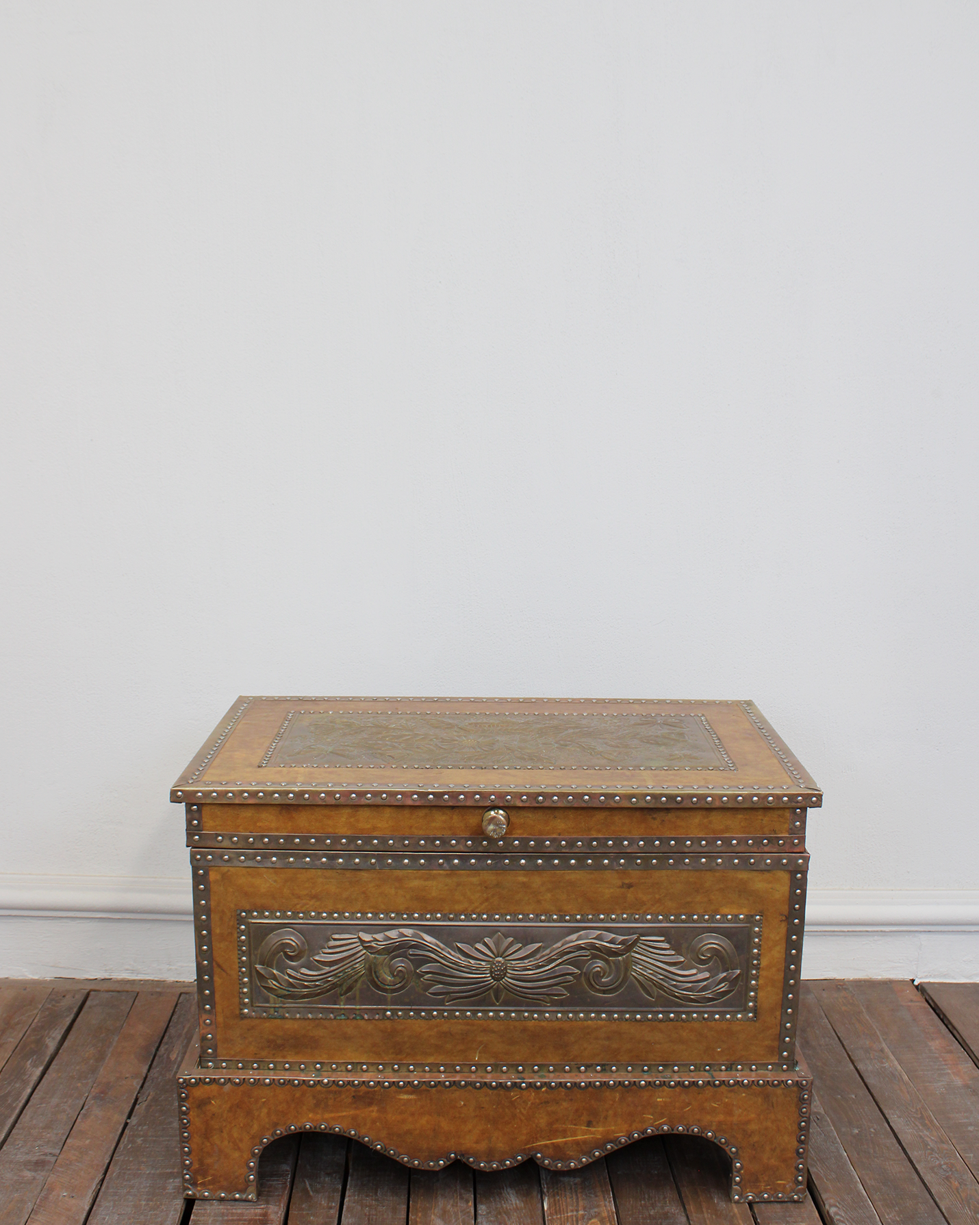 Baúl vintage estilo Colonial forrado en cuero con repujado en lámina metálica plateada con motivos florales y vegetales. Presenta remaches metálicos que enmarcan toda la pieza. Ideal como pieza decorativa, mesa de centro o como baúl de almacenaje.