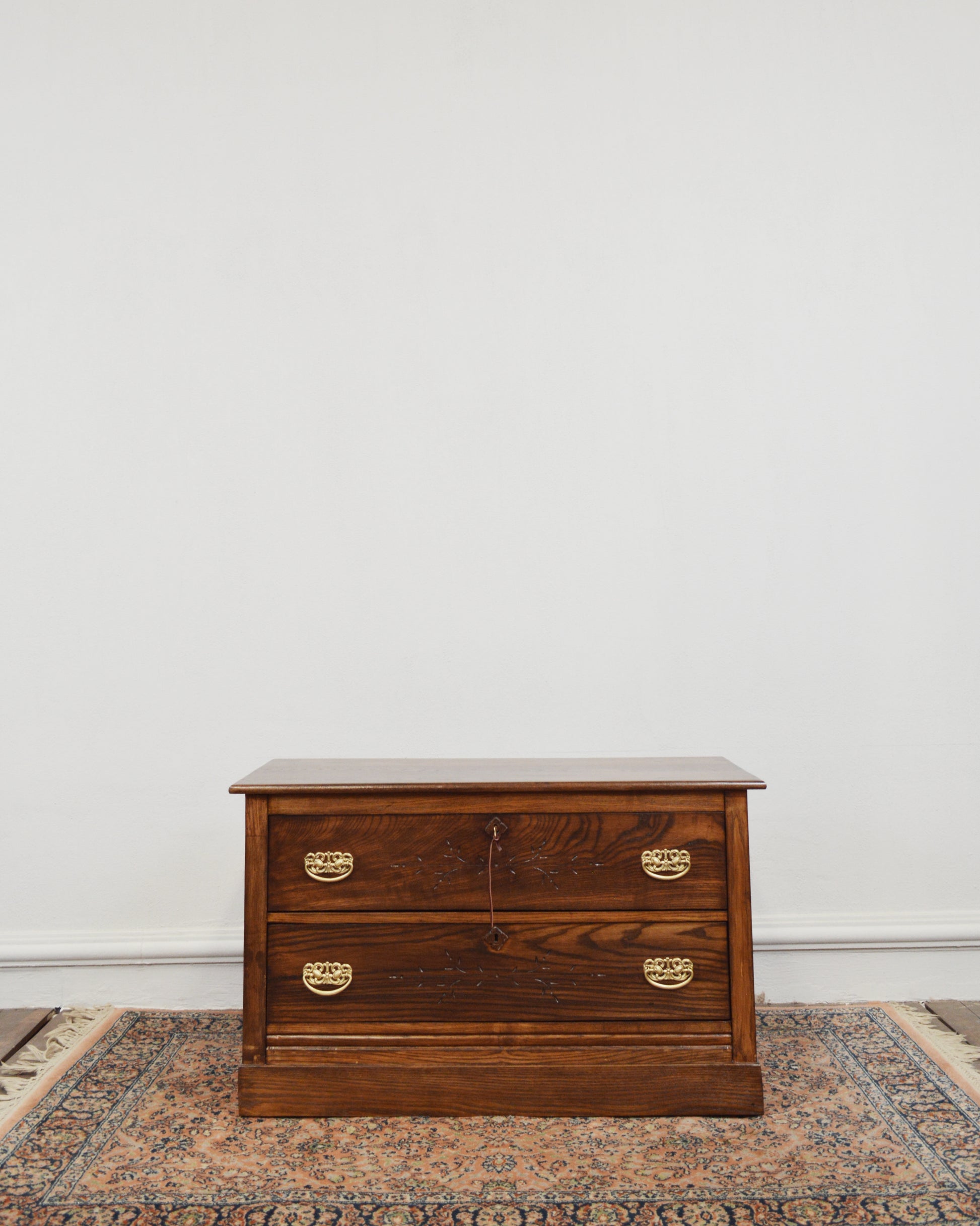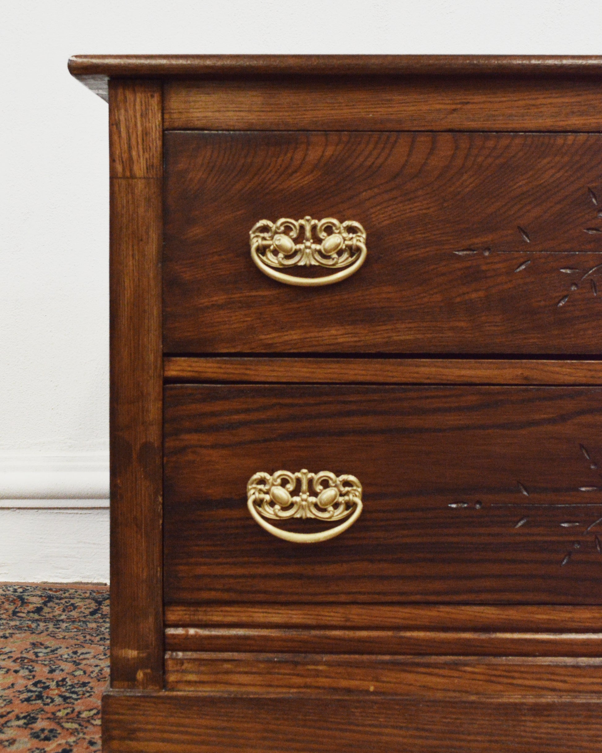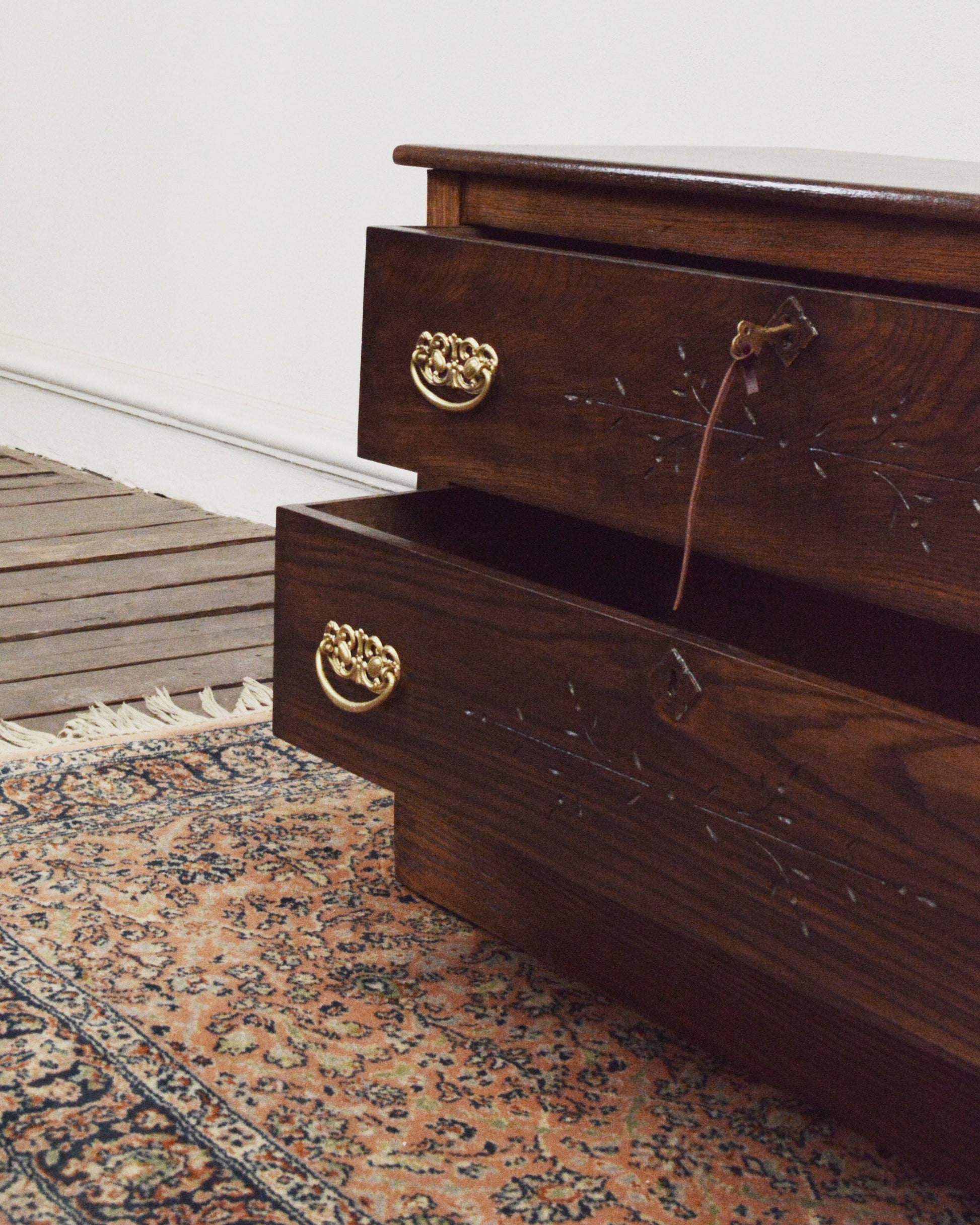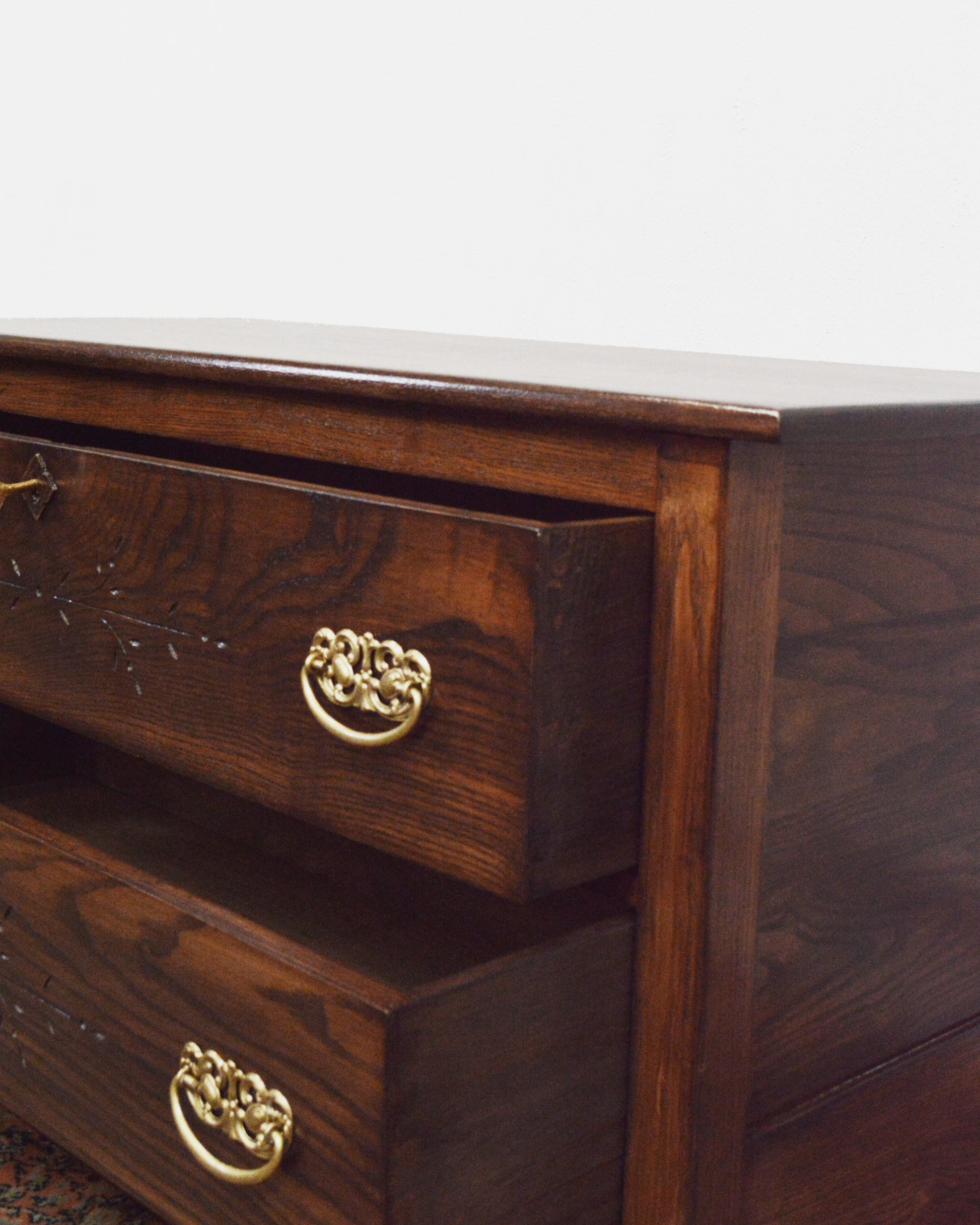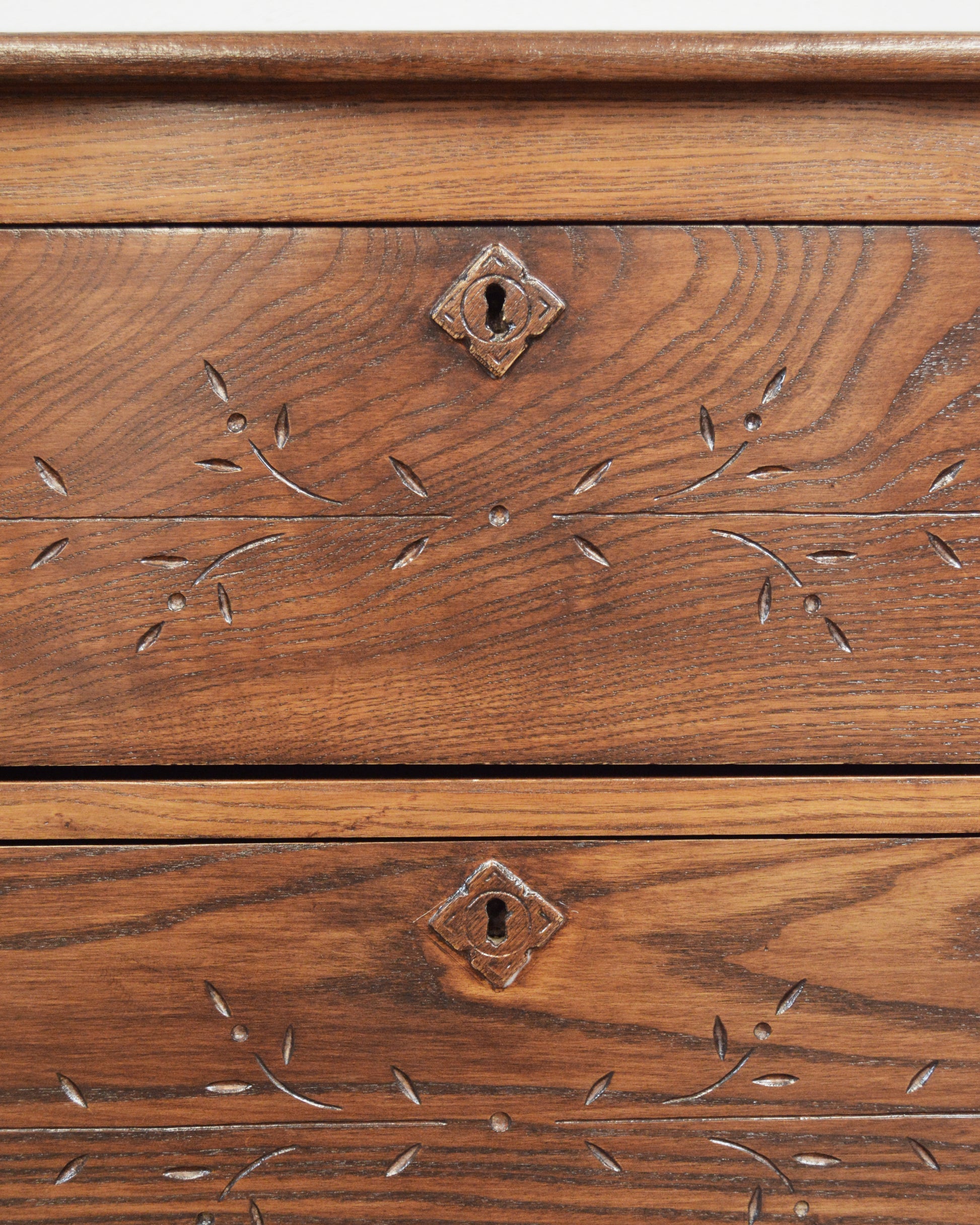 Cajonera antigua de finales del siglo XIX/ principios del XX, elaborada en madera de encino macizo con tablas gruesas y ensambles tradicionales. Cuenta con dos cajones decorados con motivos florales y herrajes originales recubiertos en hoja de oro. Cuenta con ruedas ocultas que facilitan su desplazamiento.