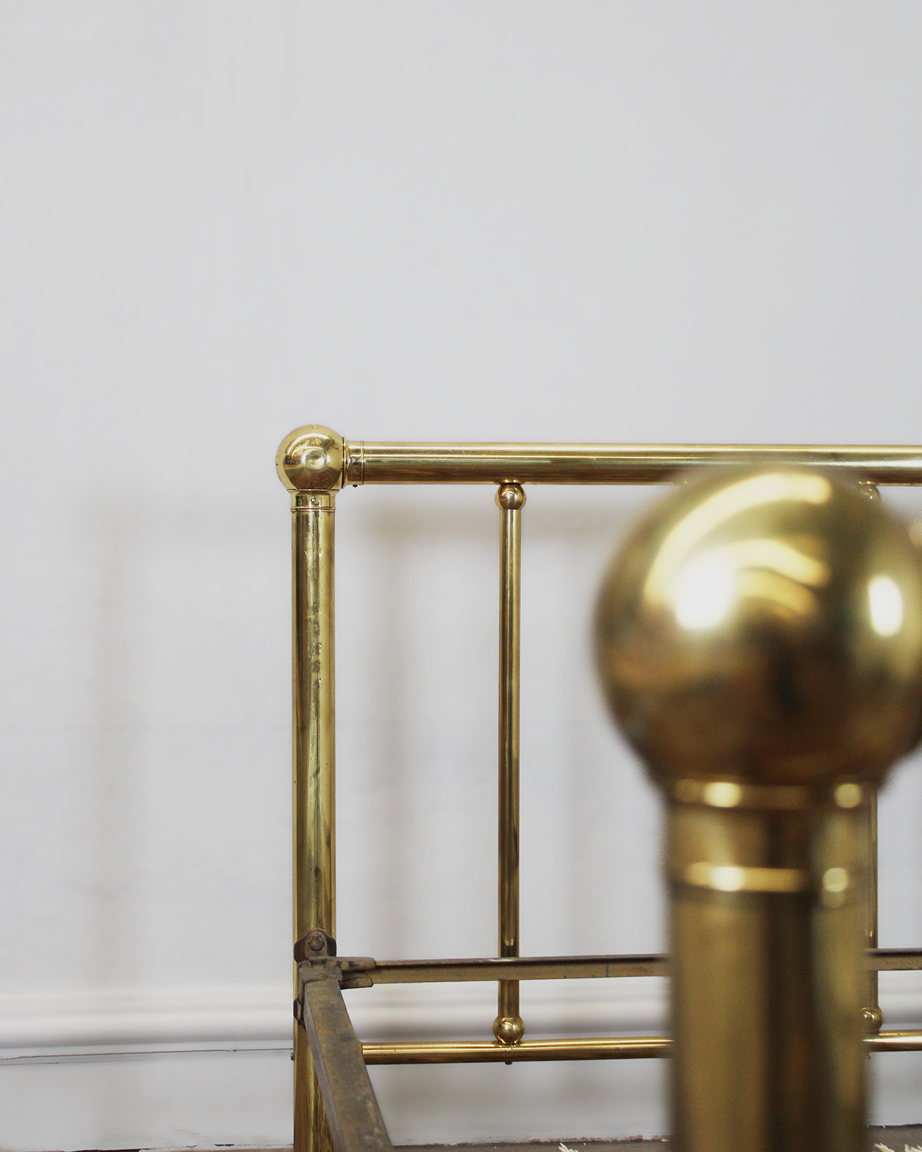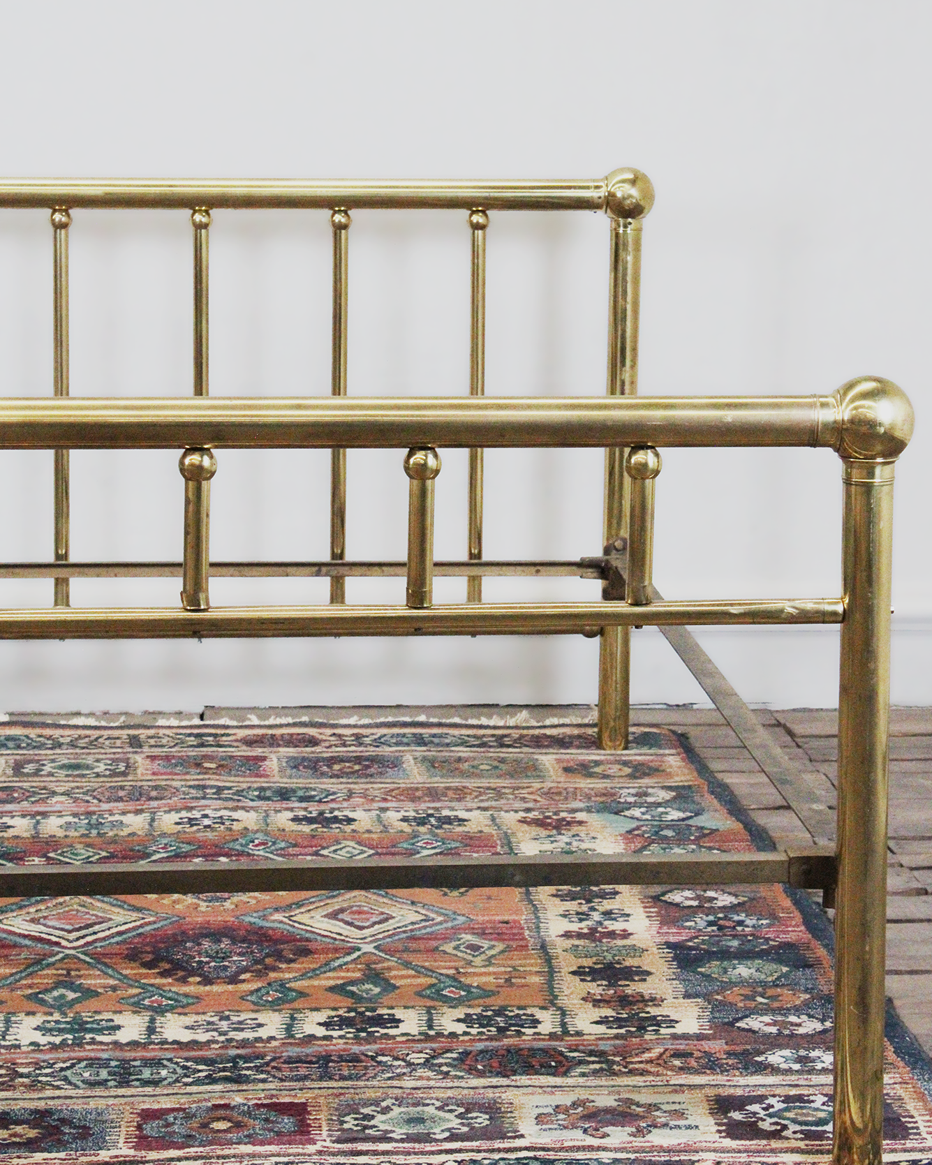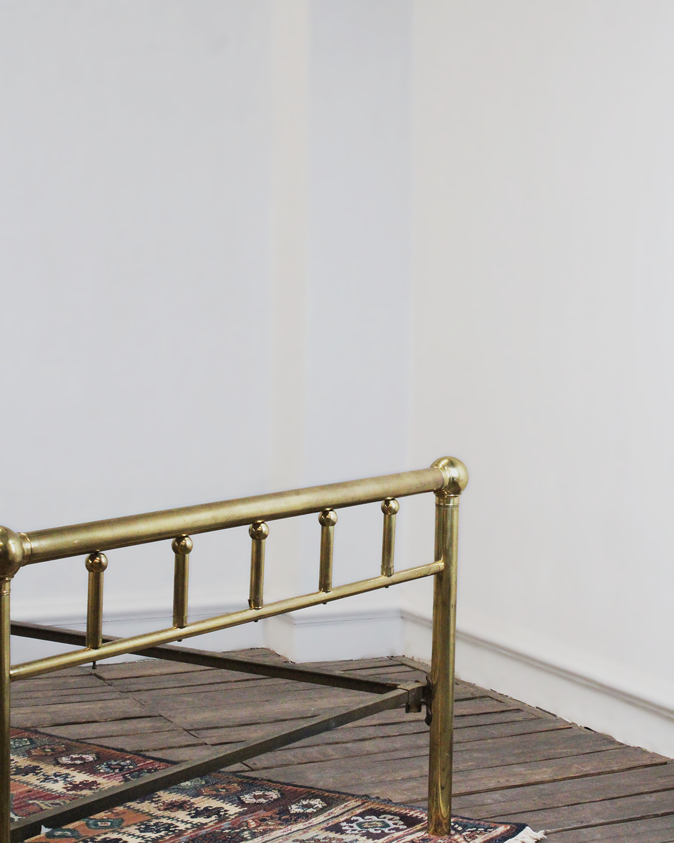 Elegante cama antigua de estructura tubular de estilo Victoriano elaborada entre 1880 y 1910. Fabricada en latón dorado con acabado natural envejecido, con remates esféricos, barrotes verticales y sistema original de ensamblaje metálico numerado.