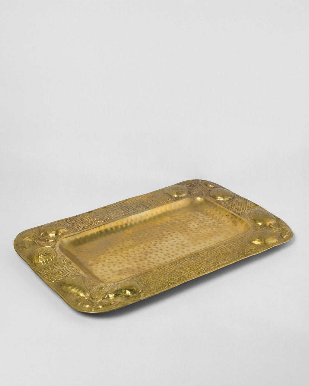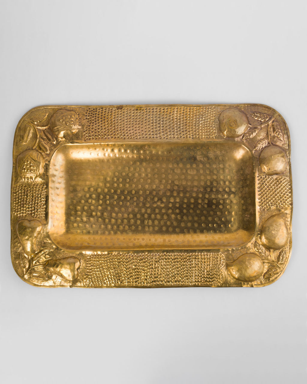 Charola elaborada en latón martelé dorado con diseño frutal en su marco.
