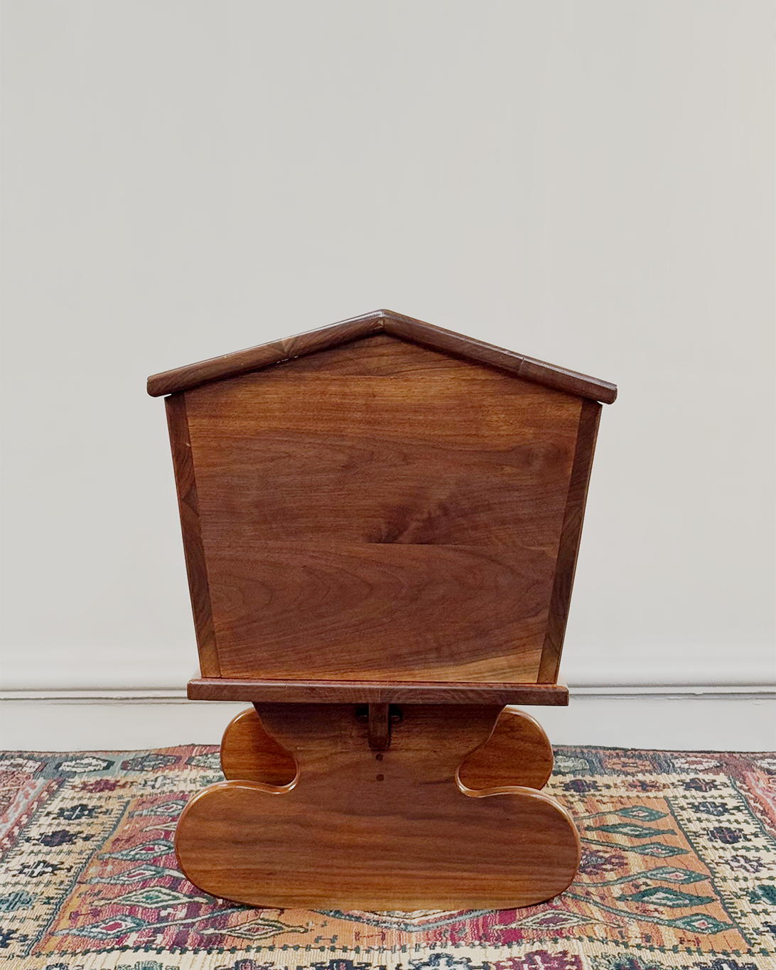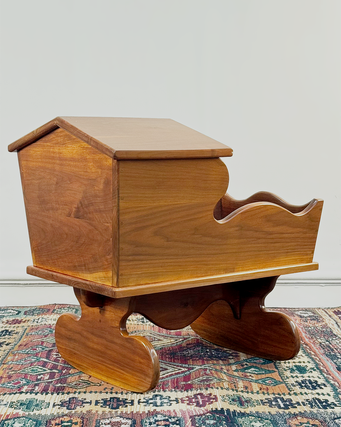 Cuna vintage mecedora de estilo rústico de mediados del siglo XX. Elaborada artesanalmente en cedro con ensamblaje de espigas y estructura cerrada con diseño de techo a dos aguas. Pieza decorativa.