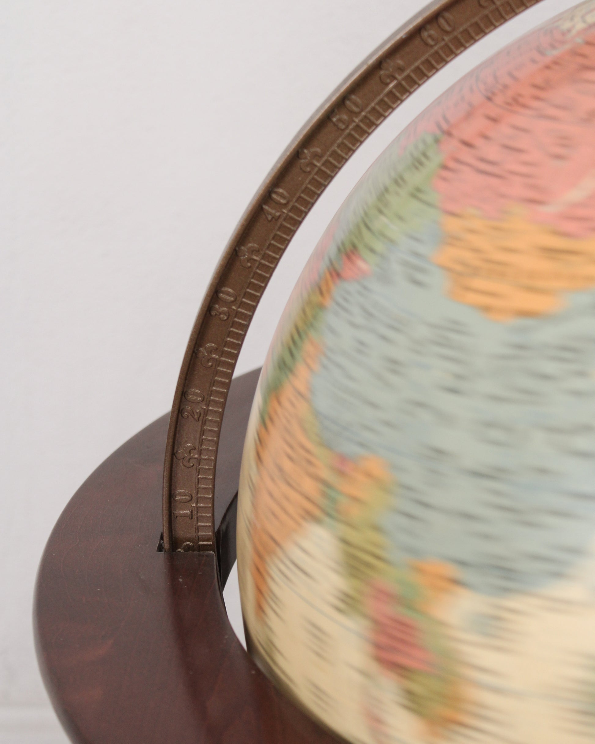 La mayoría de nuestros globos terráqueos se restauran únicamente de su base, de su sistema eléctrico y/o se les realiza una limpieza profunda, procurando no alterar directamente el papel para preservar su acabado envejecido y desgastado, lo que añade profundidad y carácter vintage a estas piezas.