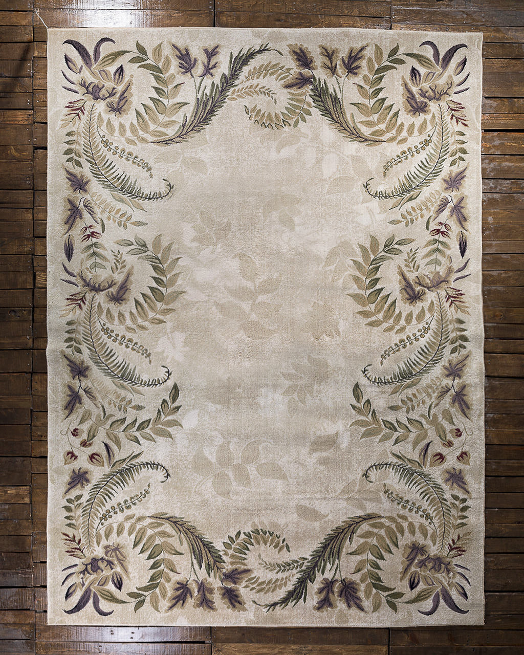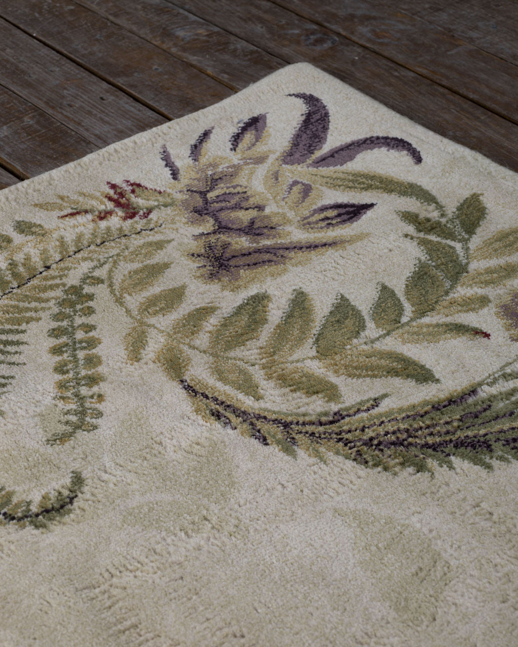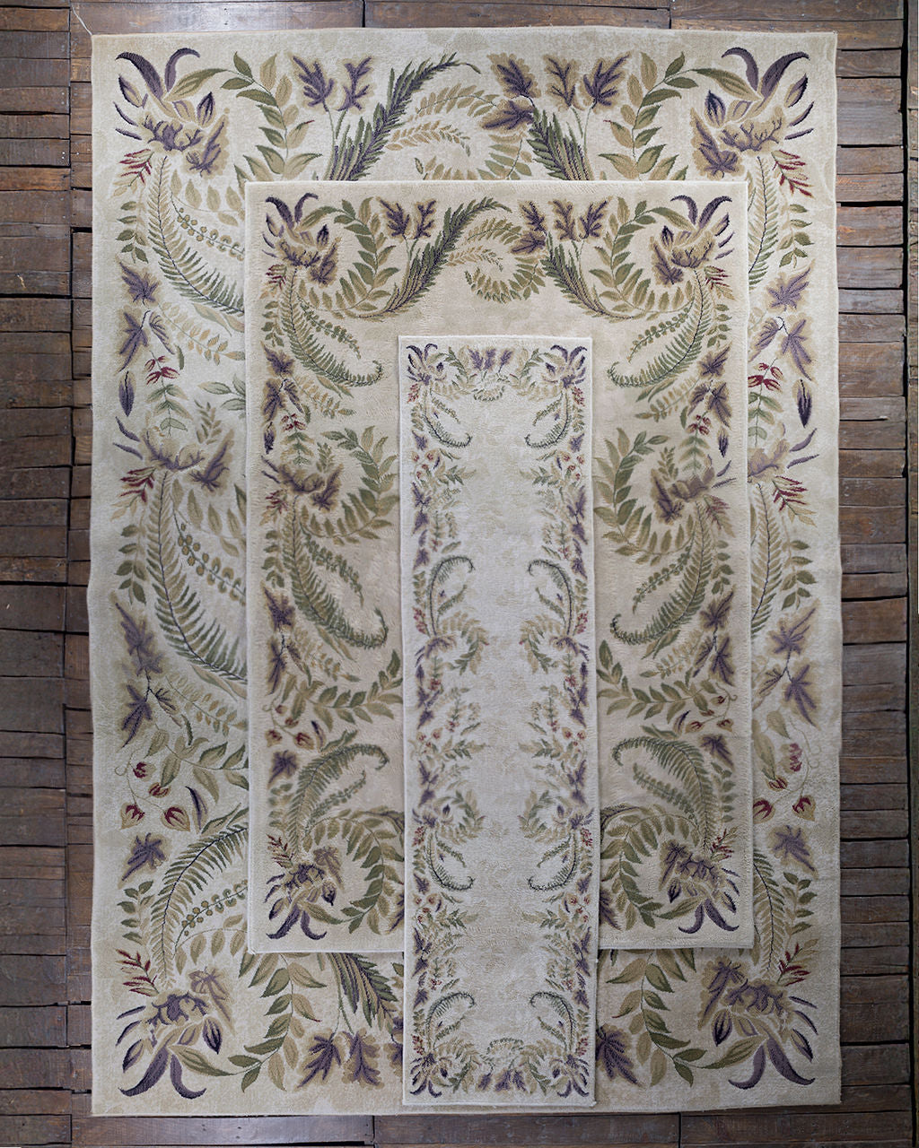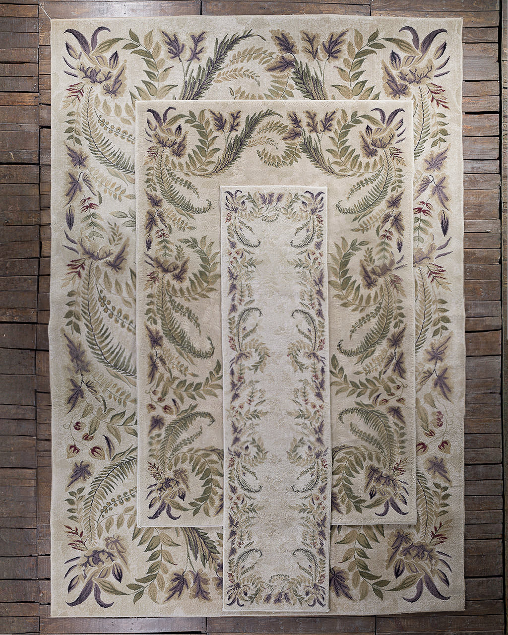 Juego de tres tapetes vintage de diferentes tamaños con motivos ornamentales vegetales que muestran hojas de helecho y guirnaldas florales dispuestas en marco. Con una paleta suave y natural con tonos beige, verdes y violetas apagados que evocan elegancia y serenidad.
