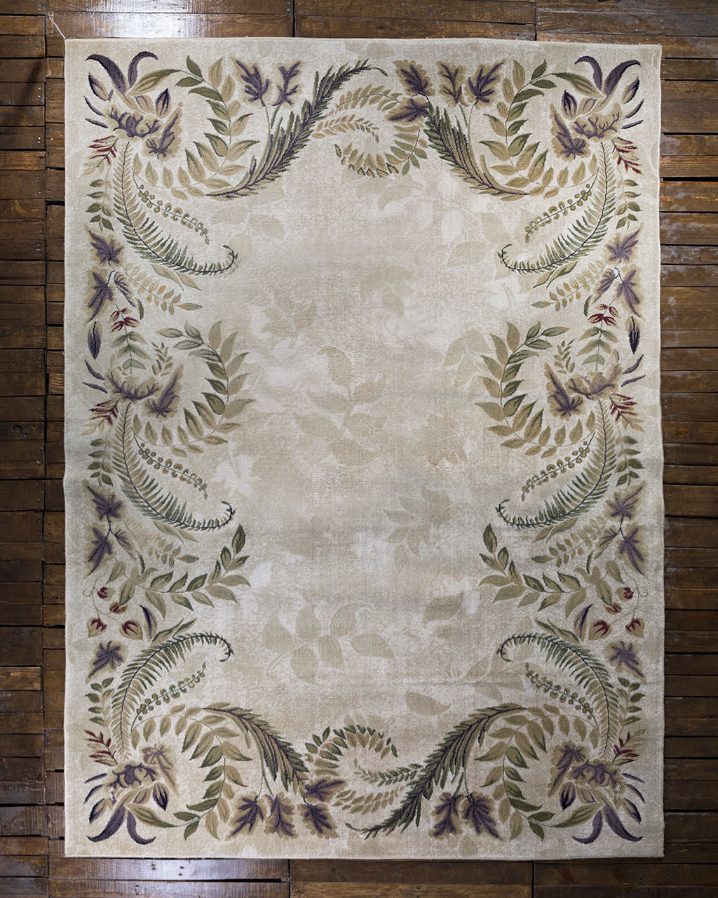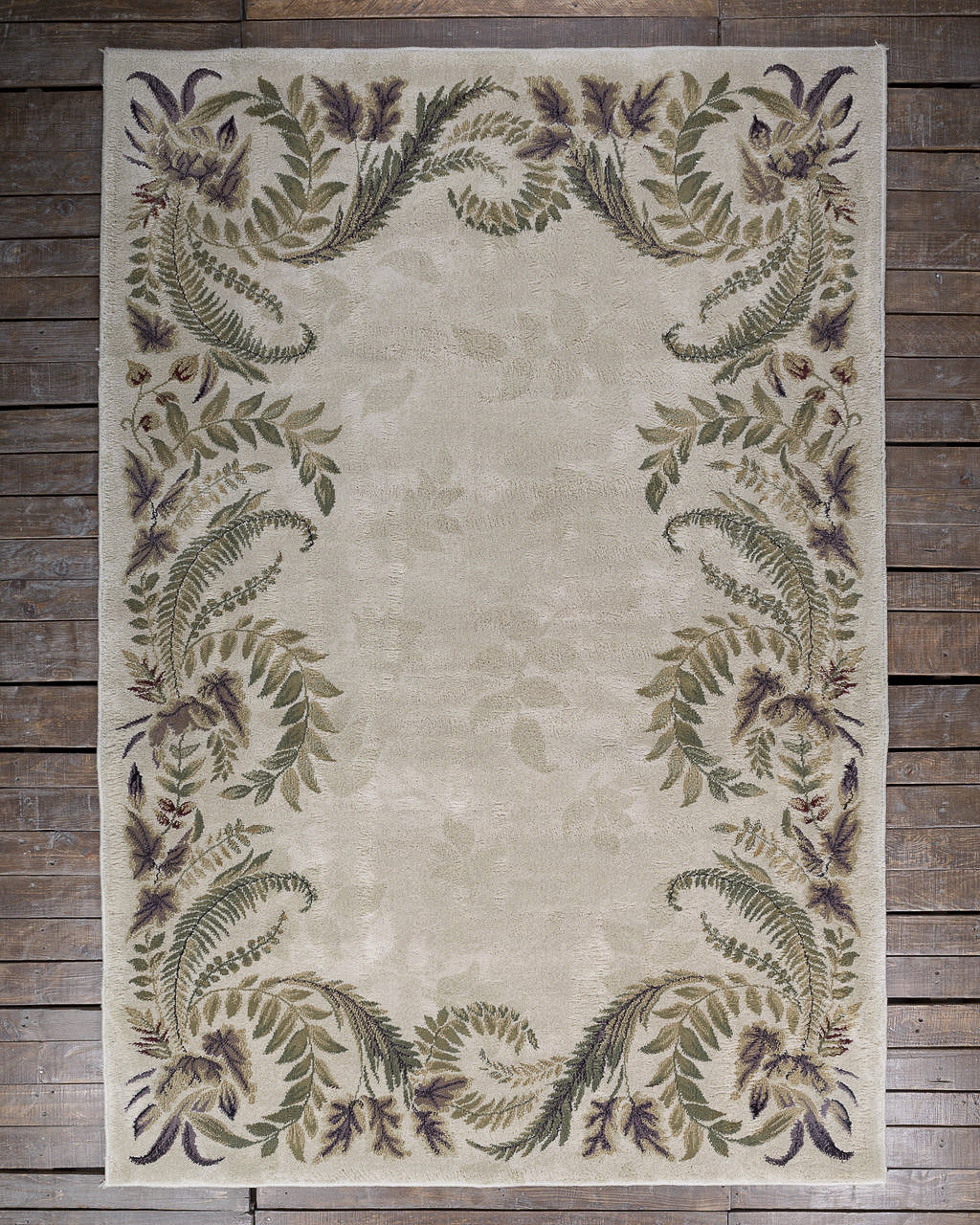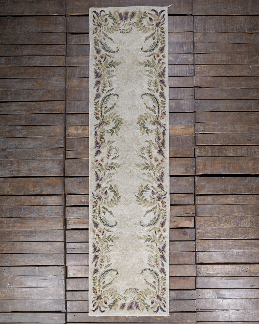 Juego de tres tapetes vintage de diferentes tamaños con motivos ornamentales vegetales que muestran hojas de helecho y guirnaldas florales dispuestas en marco. Con una paleta suave y natural con tonos beige, verdes y violetas apagados que evocan elegancia y serenidad.