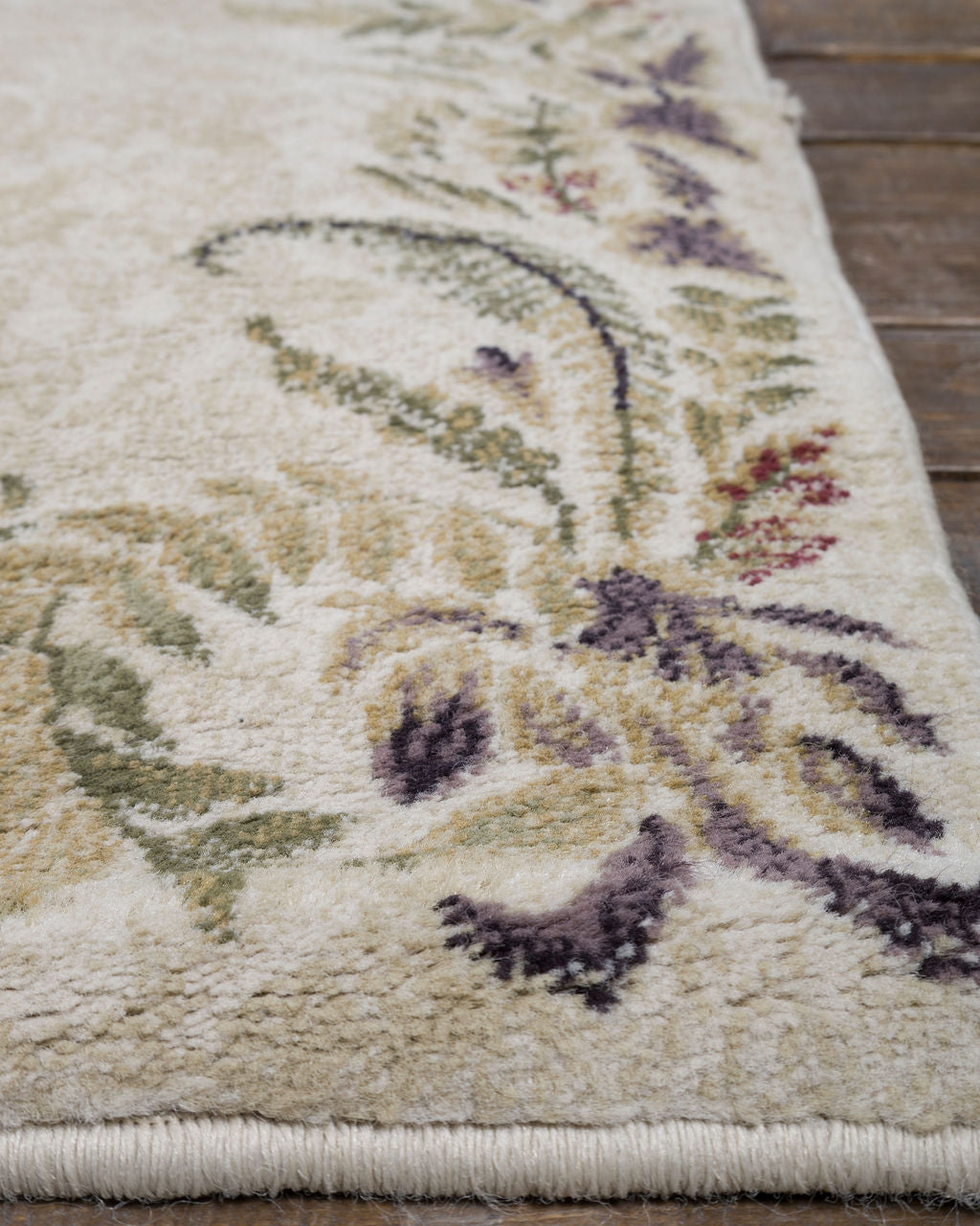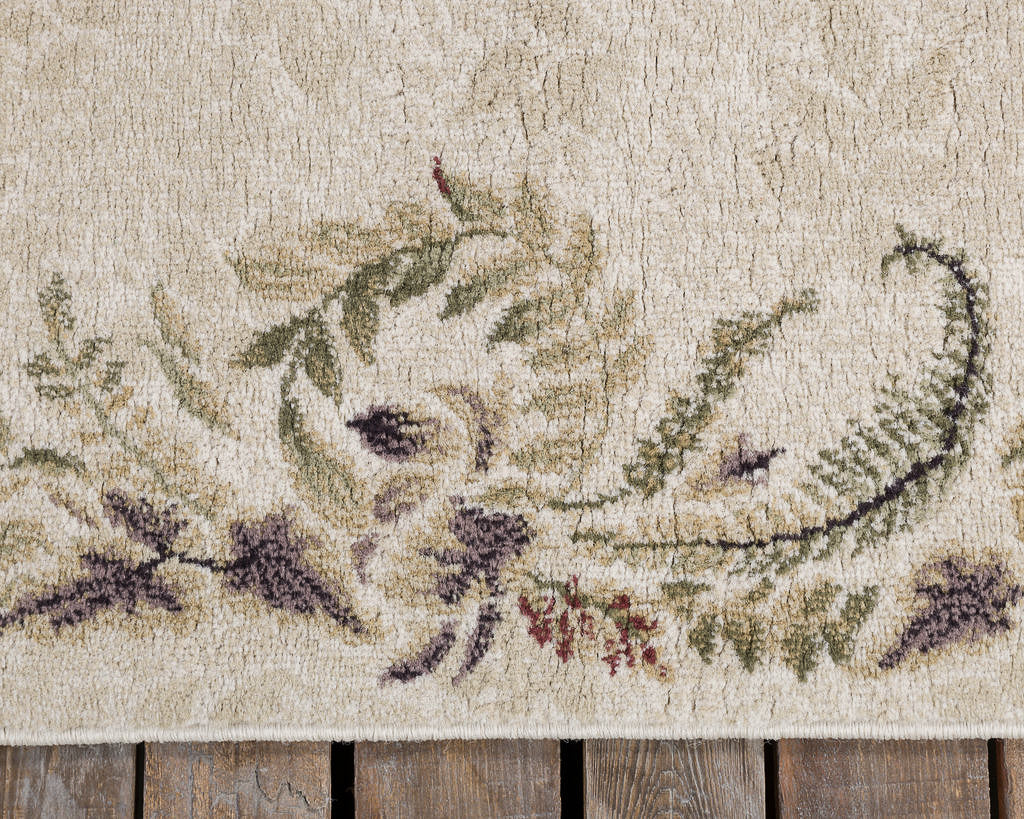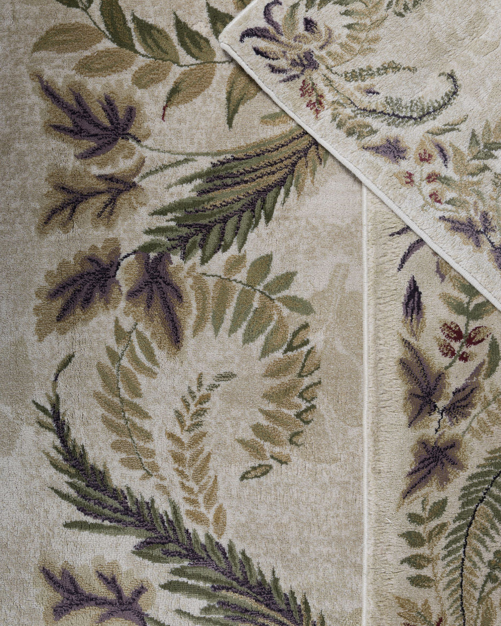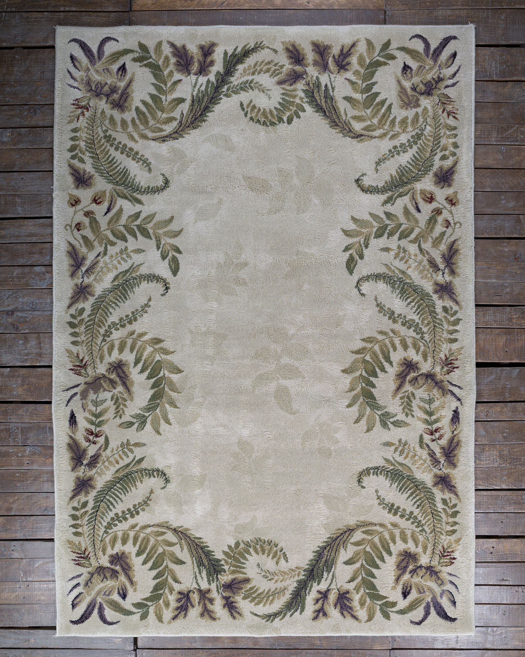 Juego de tres tapetes vintage de diferentes tamaños con motivos ornamentales vegetales que muestran hojas de helecho y guirnaldas florales dispuestas en marco. Con una paleta suave y natural con tonos beige, verdes y violetas apagados que evocan elegancia y serenidad.