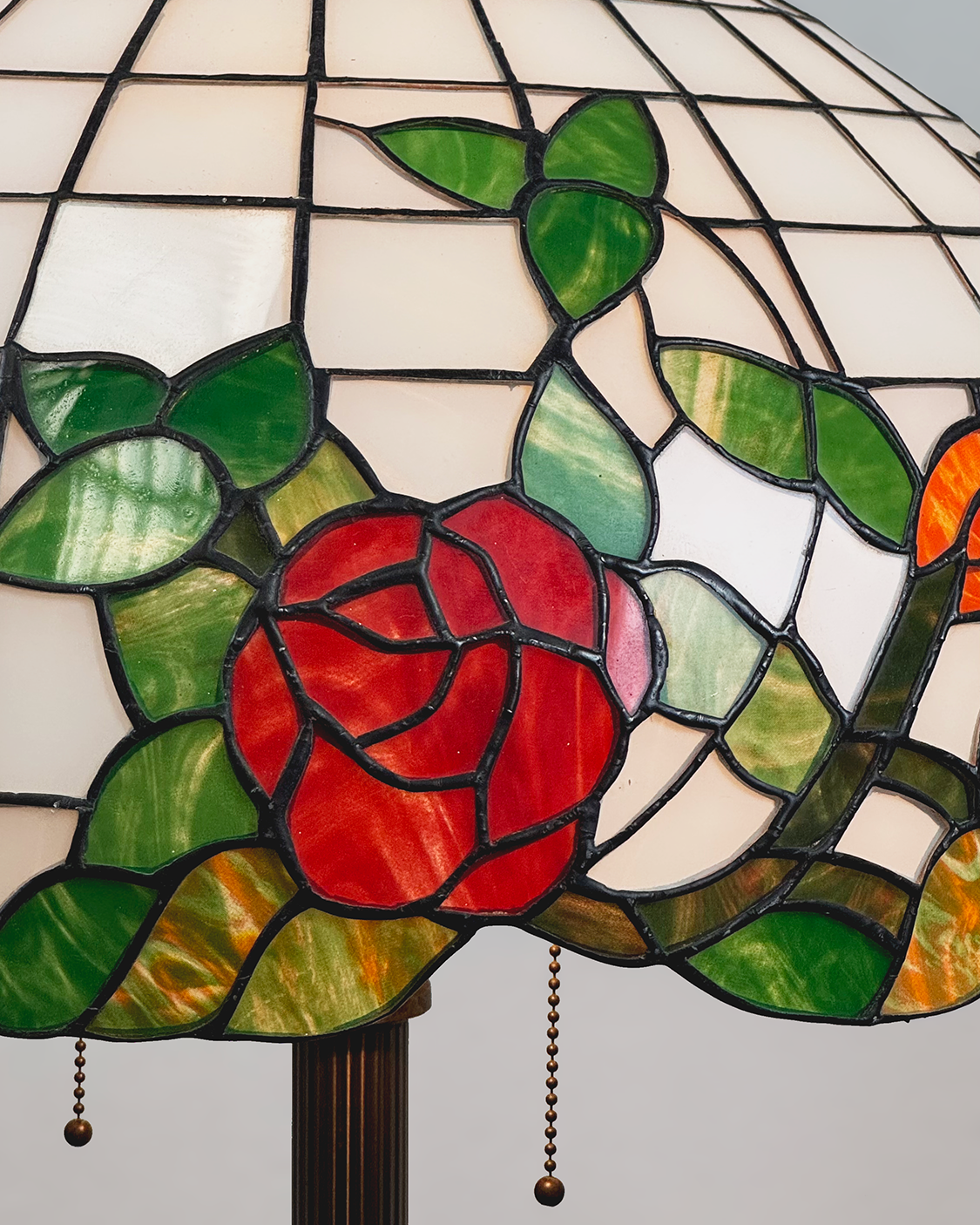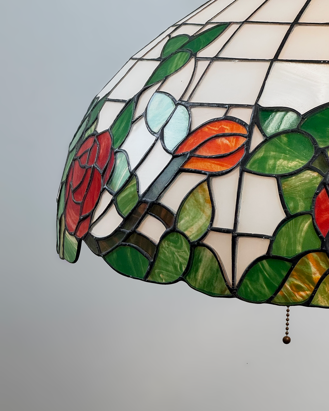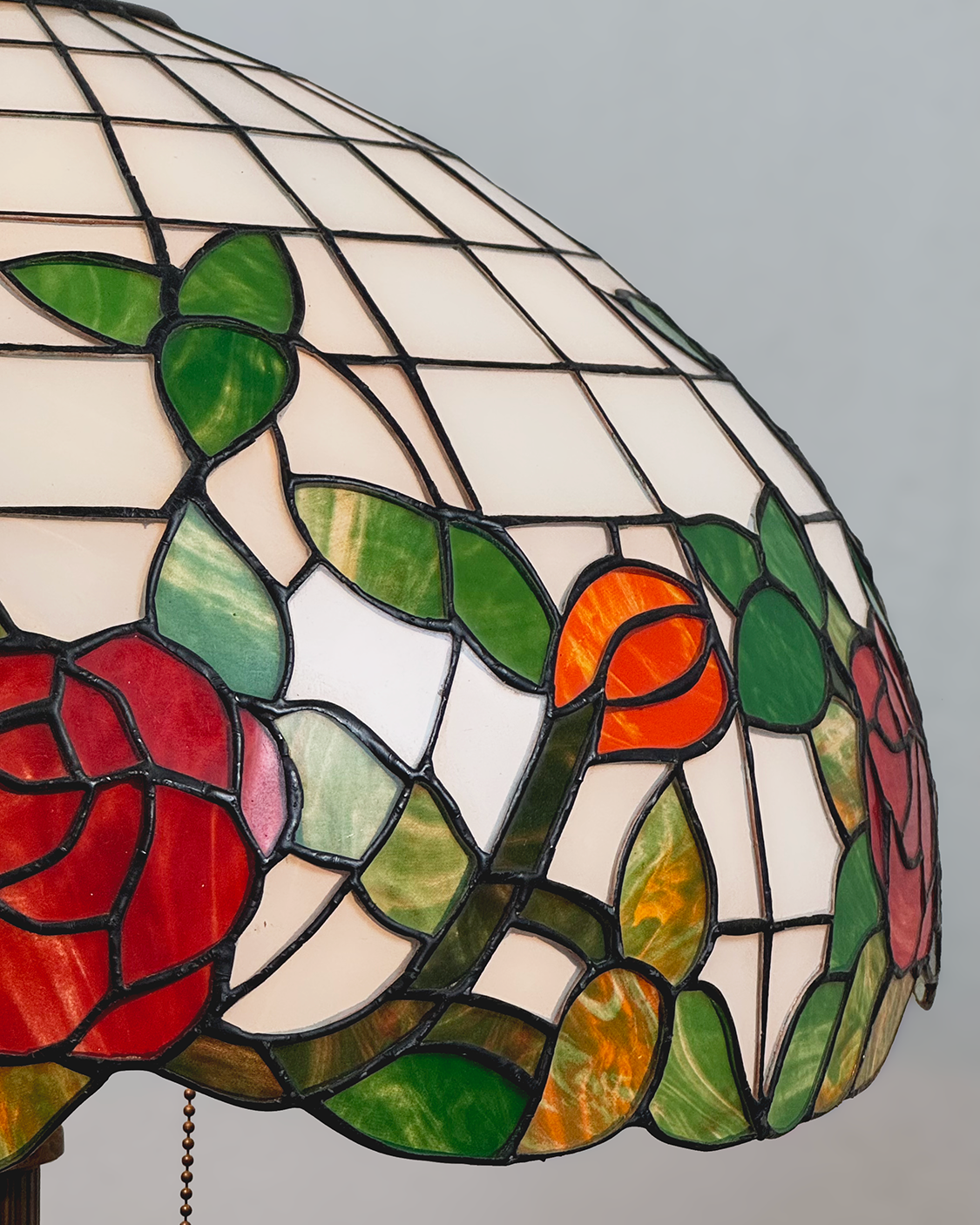 Elegante lámpara de pie tipo Tiffany, con pantalla de vidrio emplomado decorada con un patrón floral de rosas en tonos rojo, naranja y verde sobre fondo en tono marfil. Con base en metal con acabado dorado y diseño de inspiración vegetal. Equipada con dos focos operados de manera independiente mediante cadenas, permitiendo modular la intensidad de la iluminación.