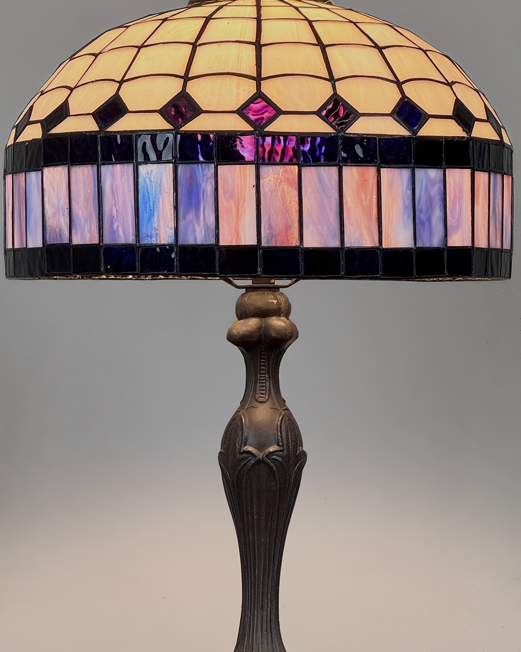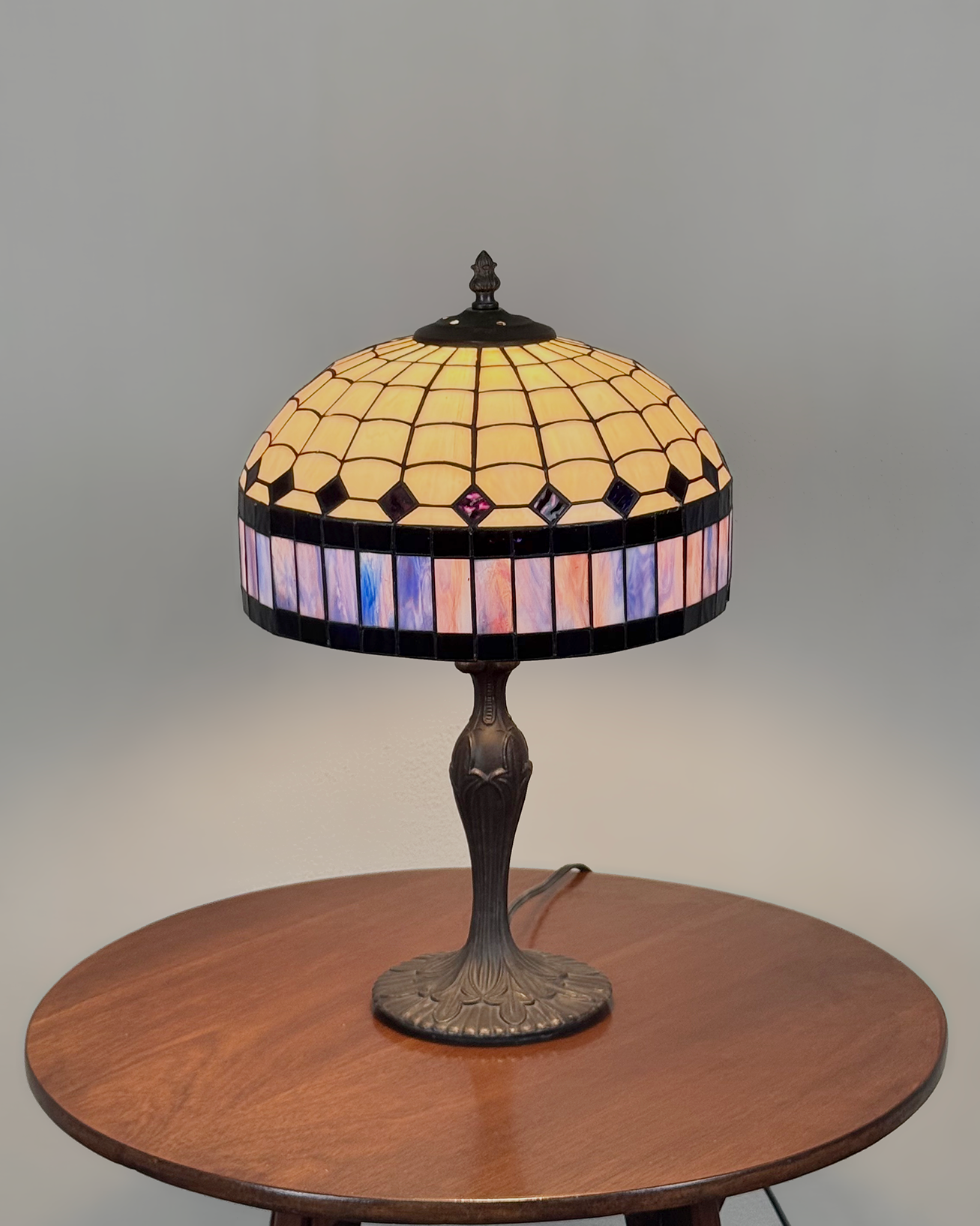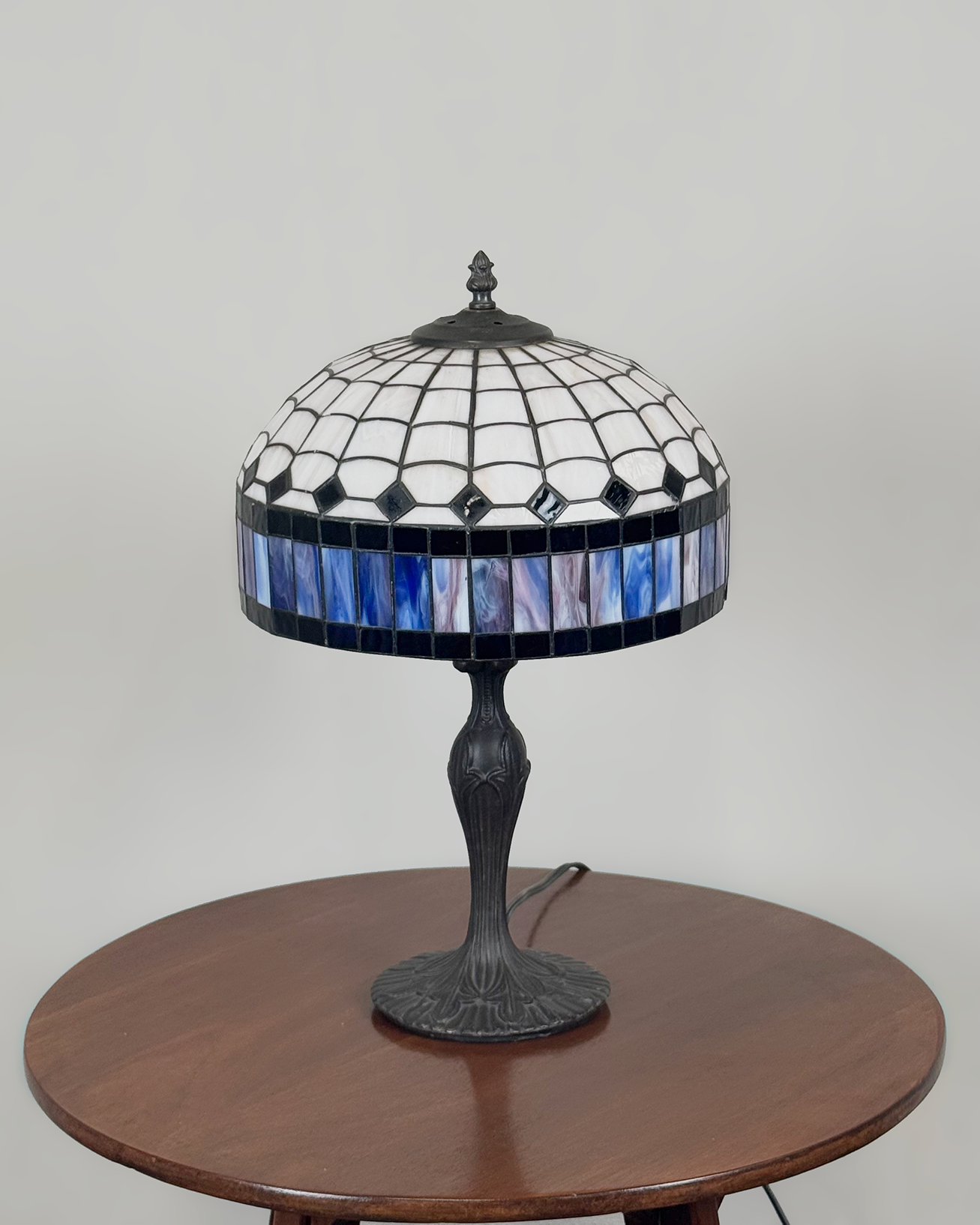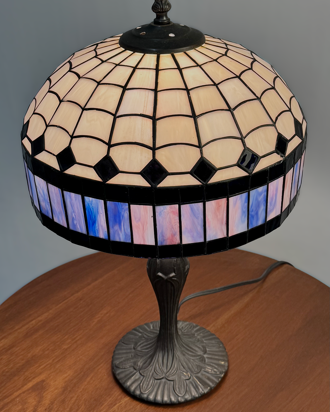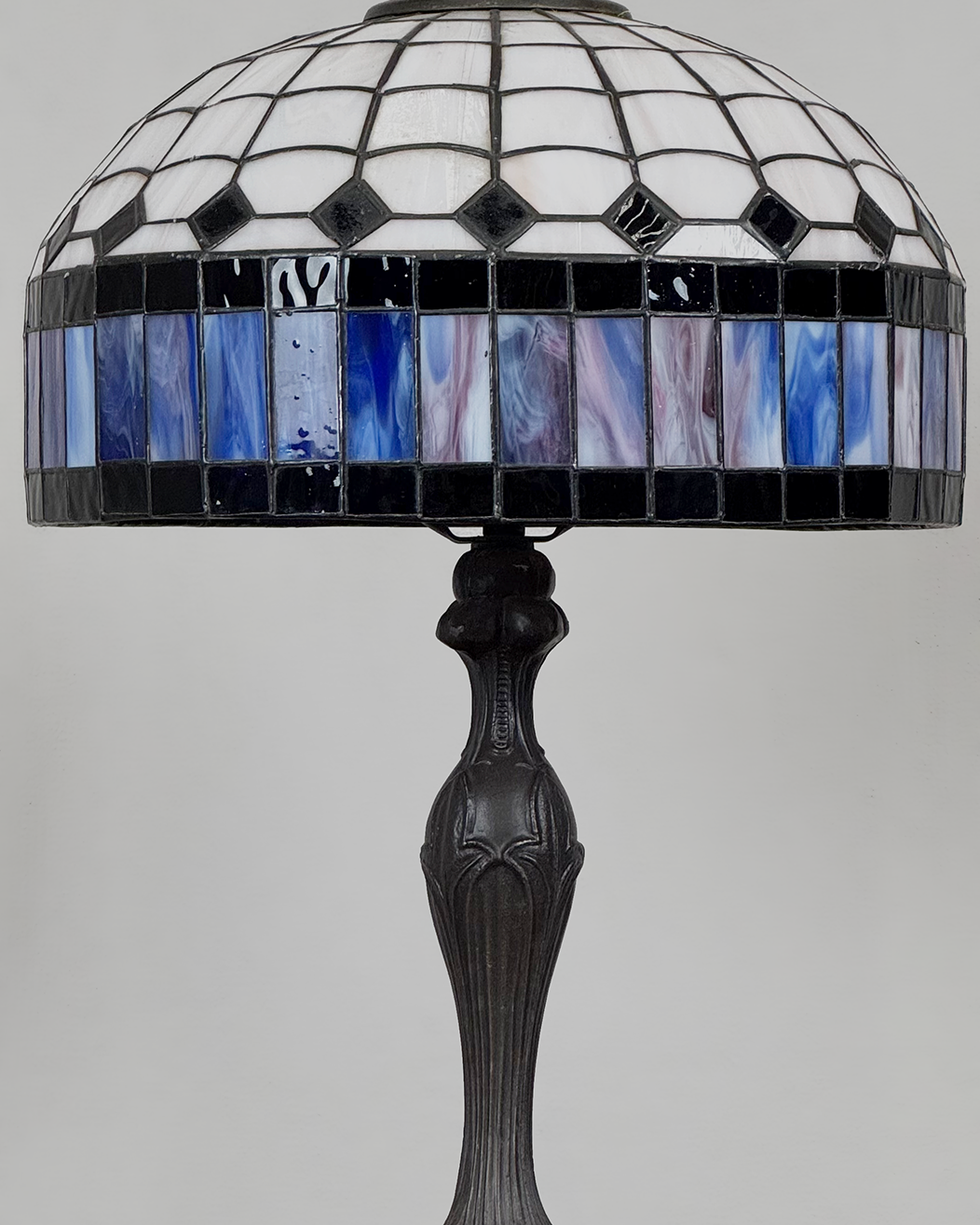 Elegante lámpara de mesa tipo Tiffany, caracterizada por su distintiva pantalla de vidrio emplomado en patrones geométricos de inspiración modernista. El diseño combina tonos marfil y negros, con una franja inferior en delicados matices de azul y lila. Con base de metal con motivos orgánicos.