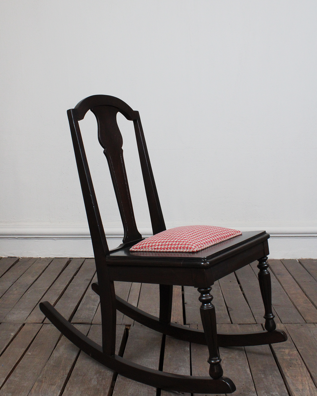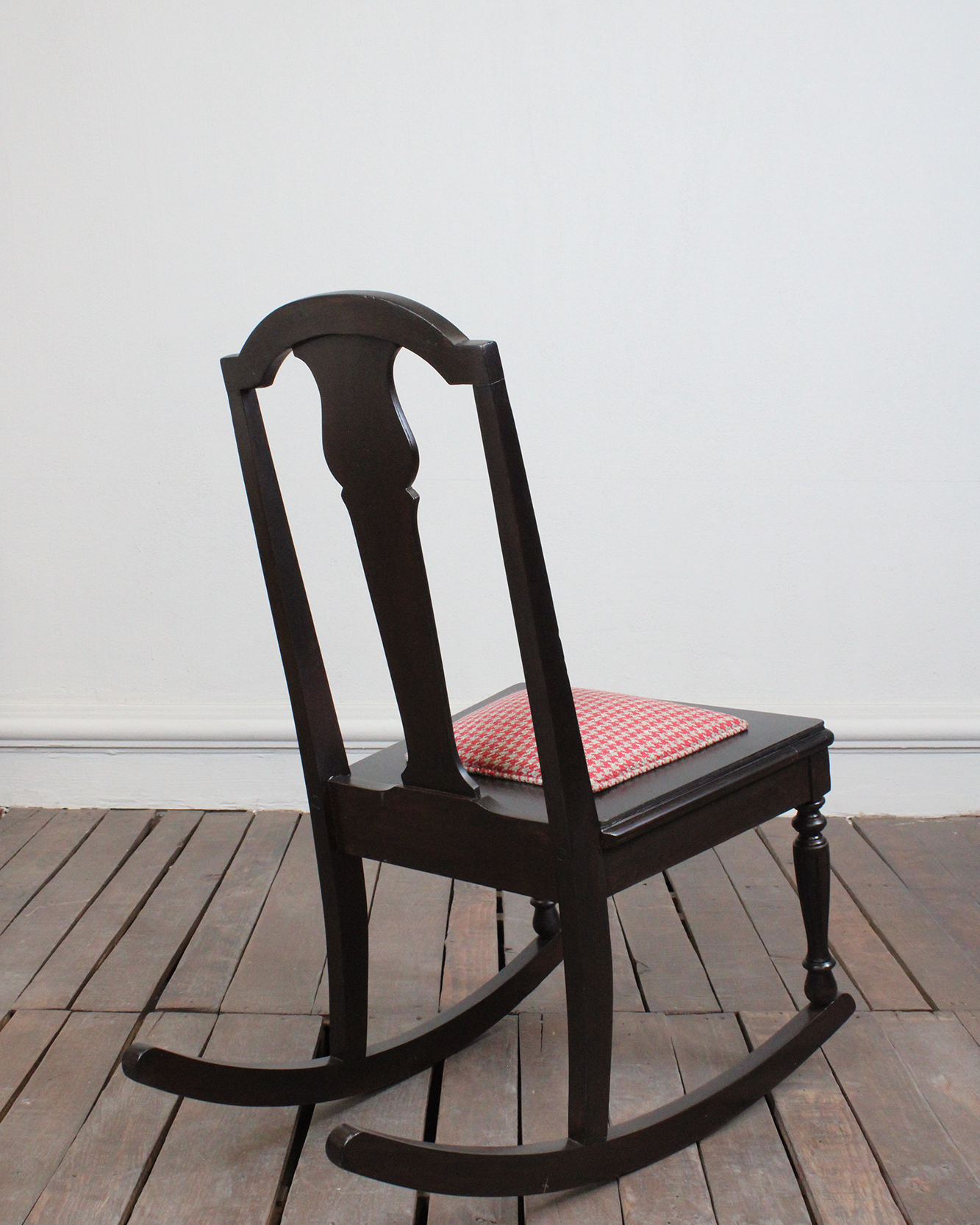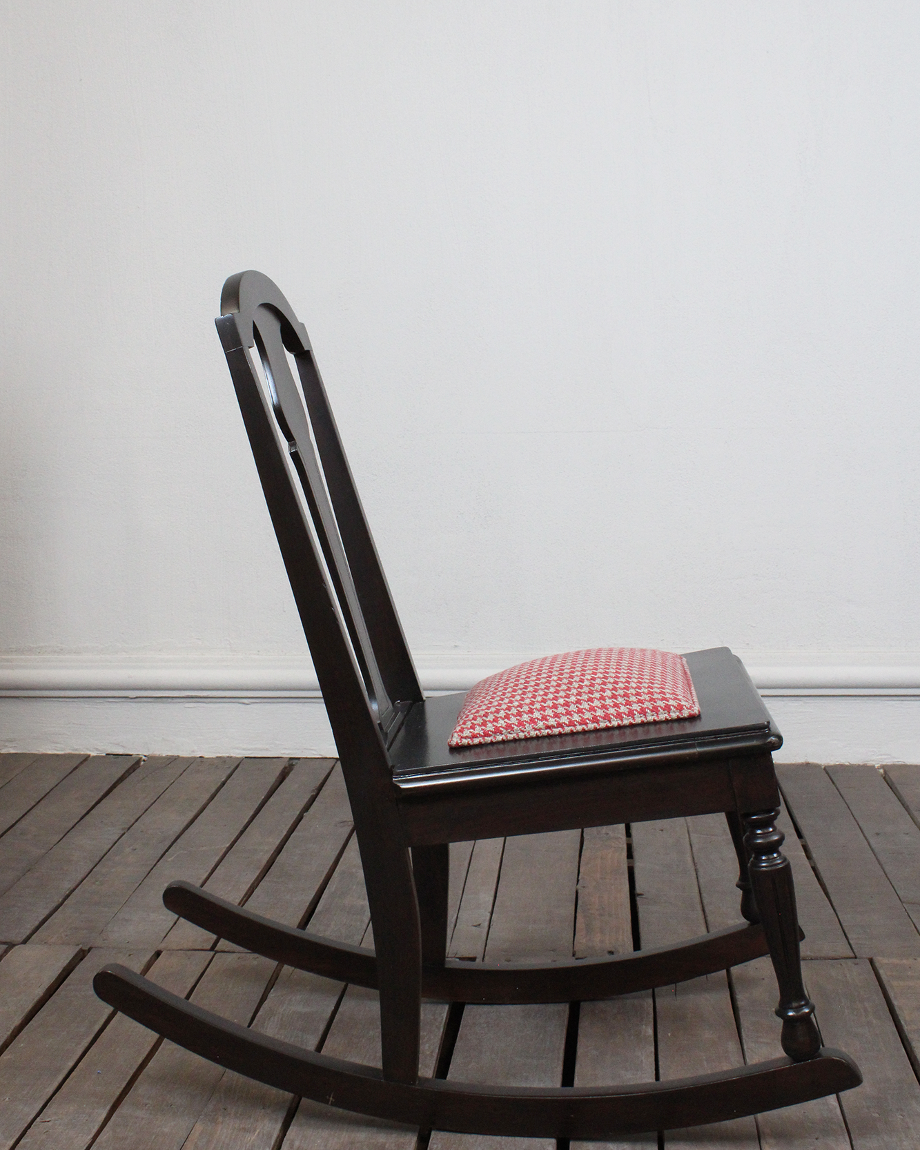 Mecedora antigua originaria de Estados Unidos de la década de 1910. Elaborada en madera de nogal. De la marca Marvel Furniture Co. Jamestown, N.Y. Con número de serie. Tapicería nueva. Ideal para niños.