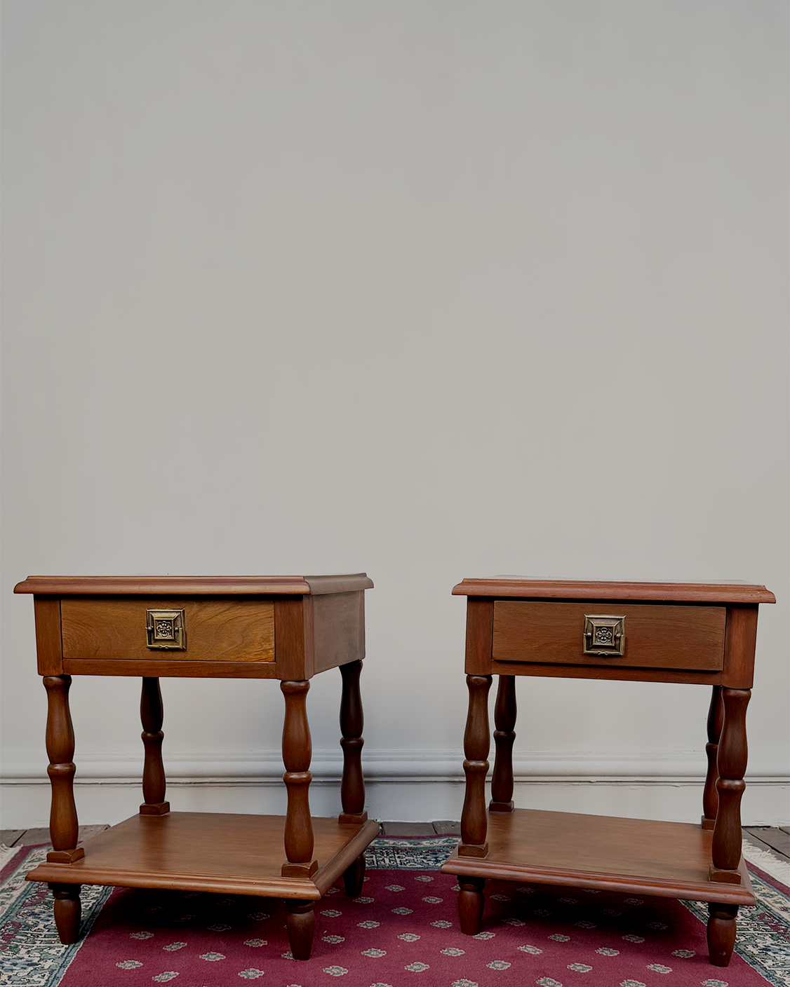 Par de burós estilo colonial mexicano en madera de caoba con acabado cálido y tonalidad media. Presentan un diseño robusto con patas torneadas, cajón superior y repisa inferior. Con herrajes de bronce envejecido.