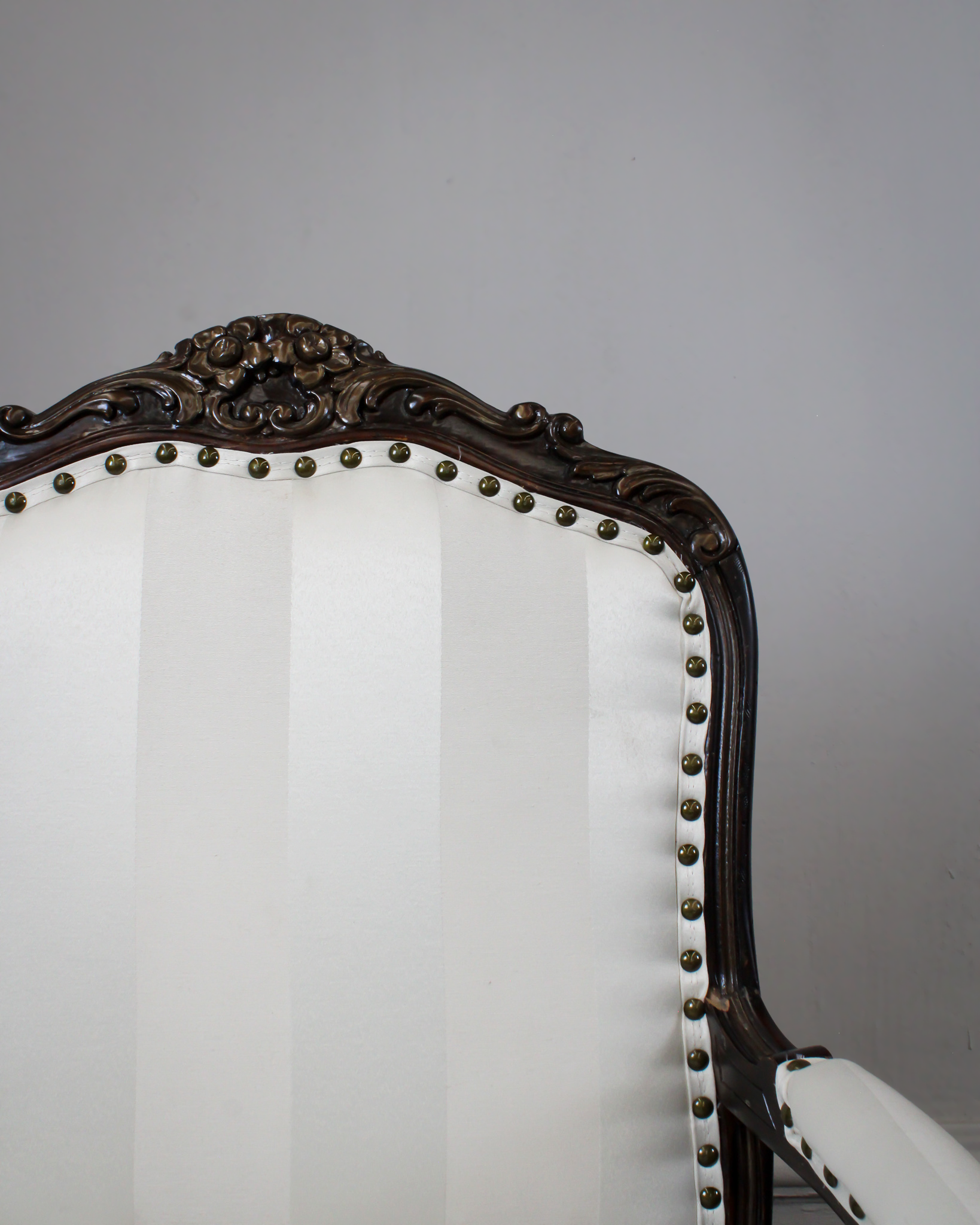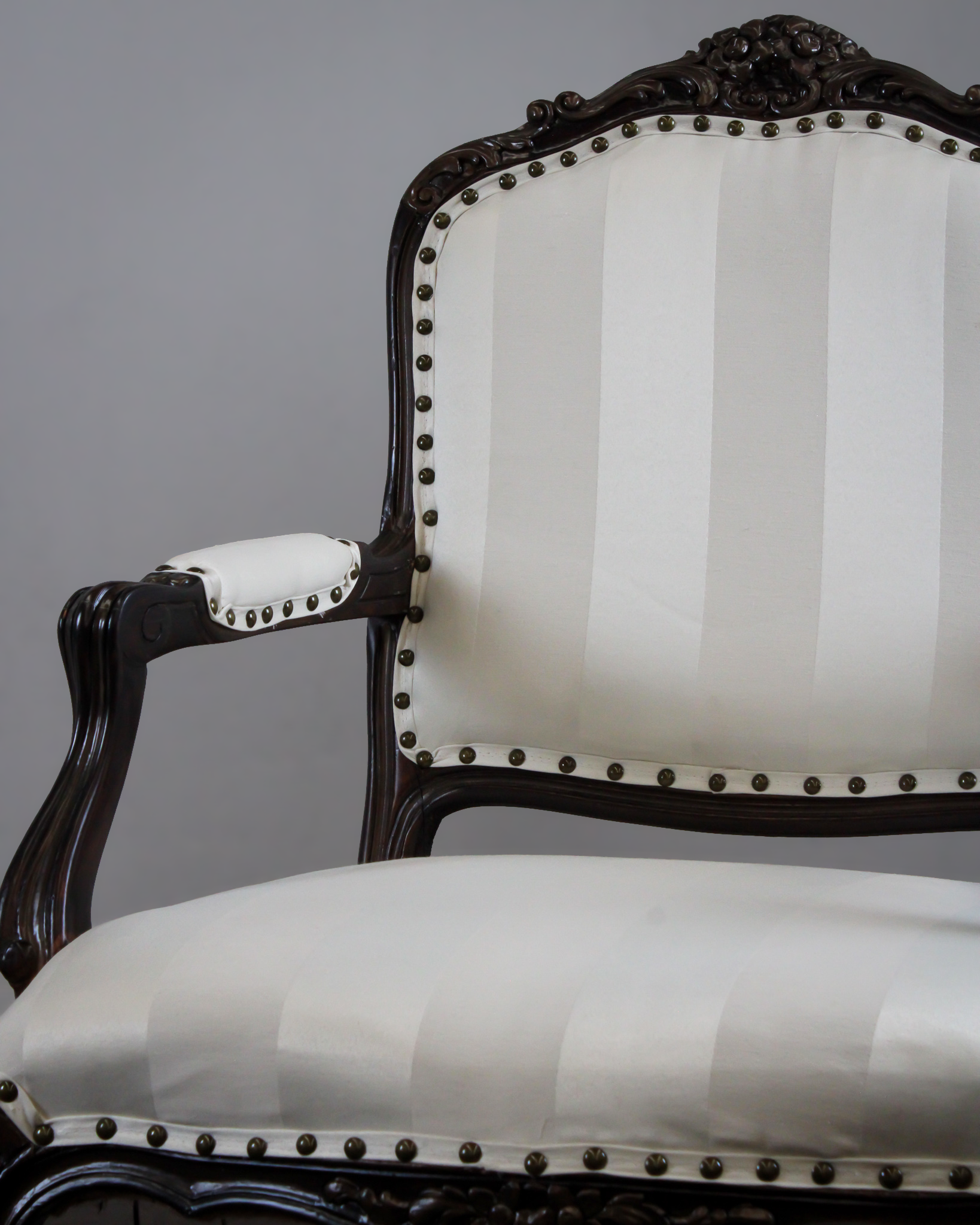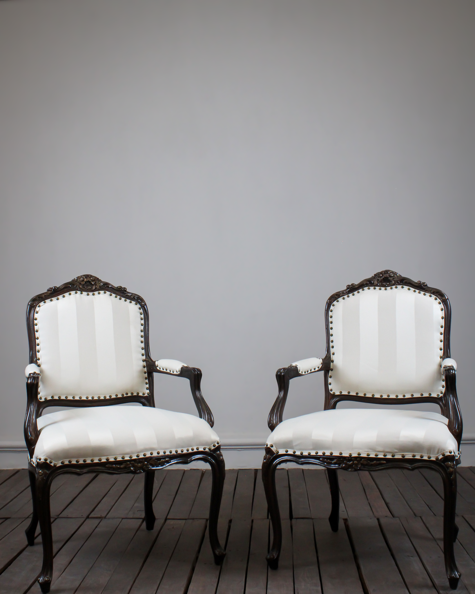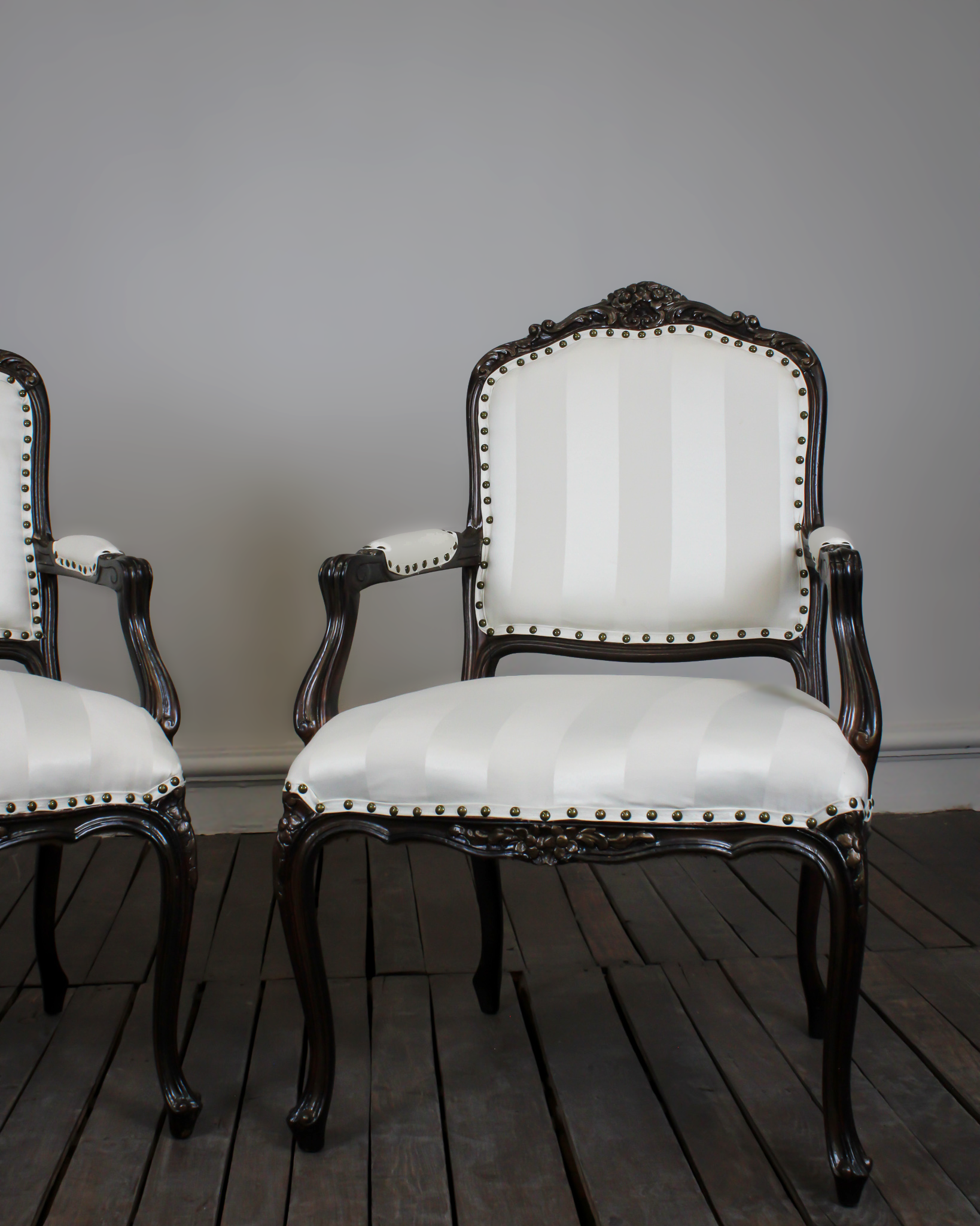 Par de sillas francesas estilo Luis XV elaboradas en madera tallada con estructura original y detalles esculpidos a mano. Con tapicería en tonos crema y hueso con diseño a rayas, rematadas con tachuelas en color oro viejo.