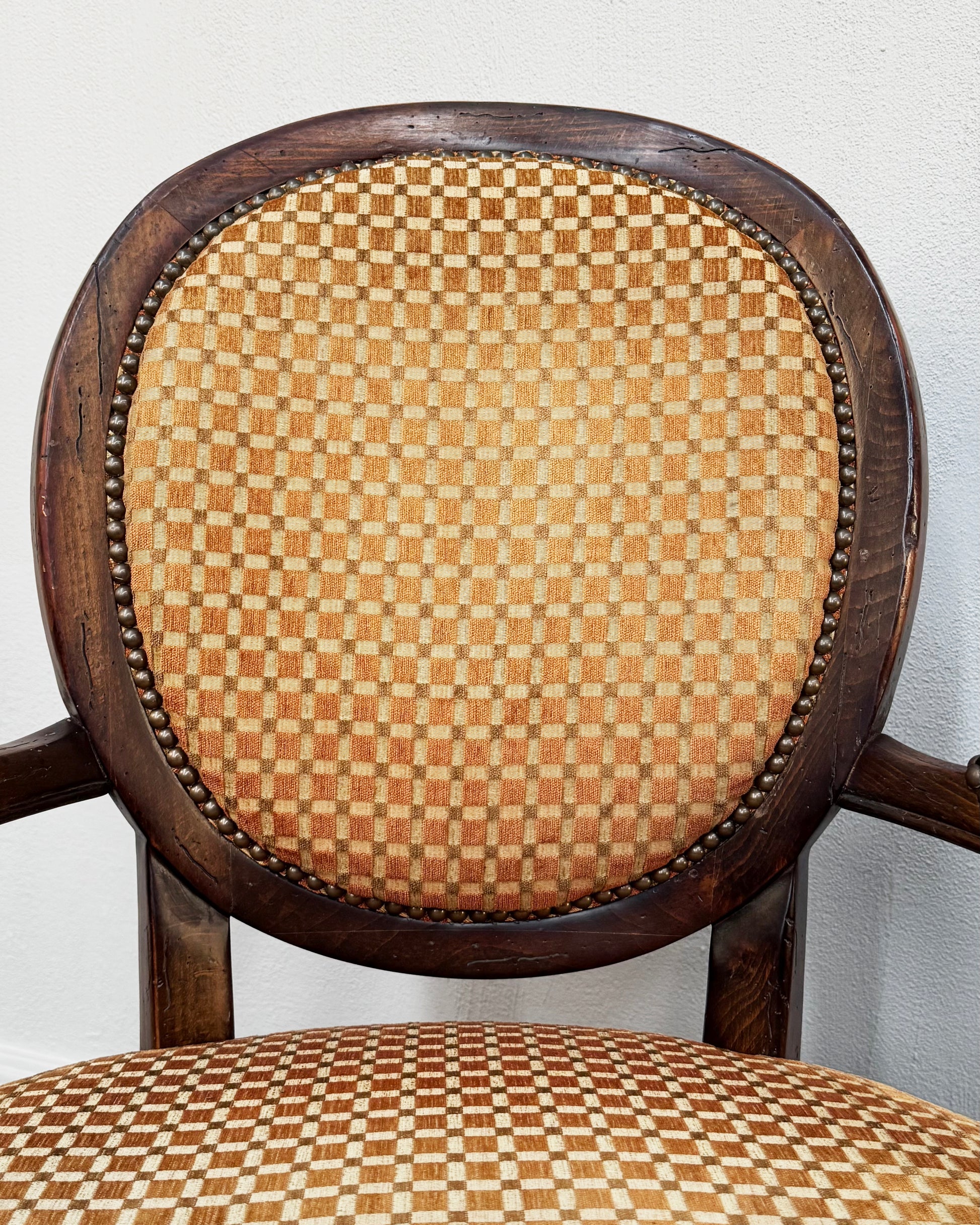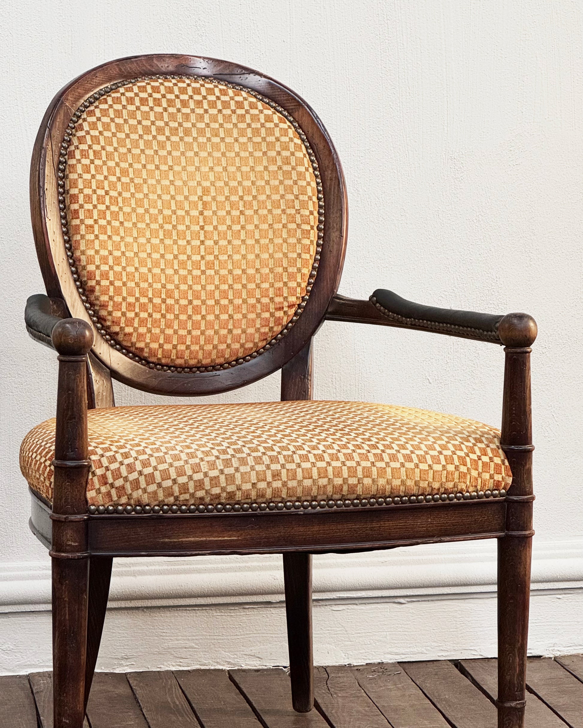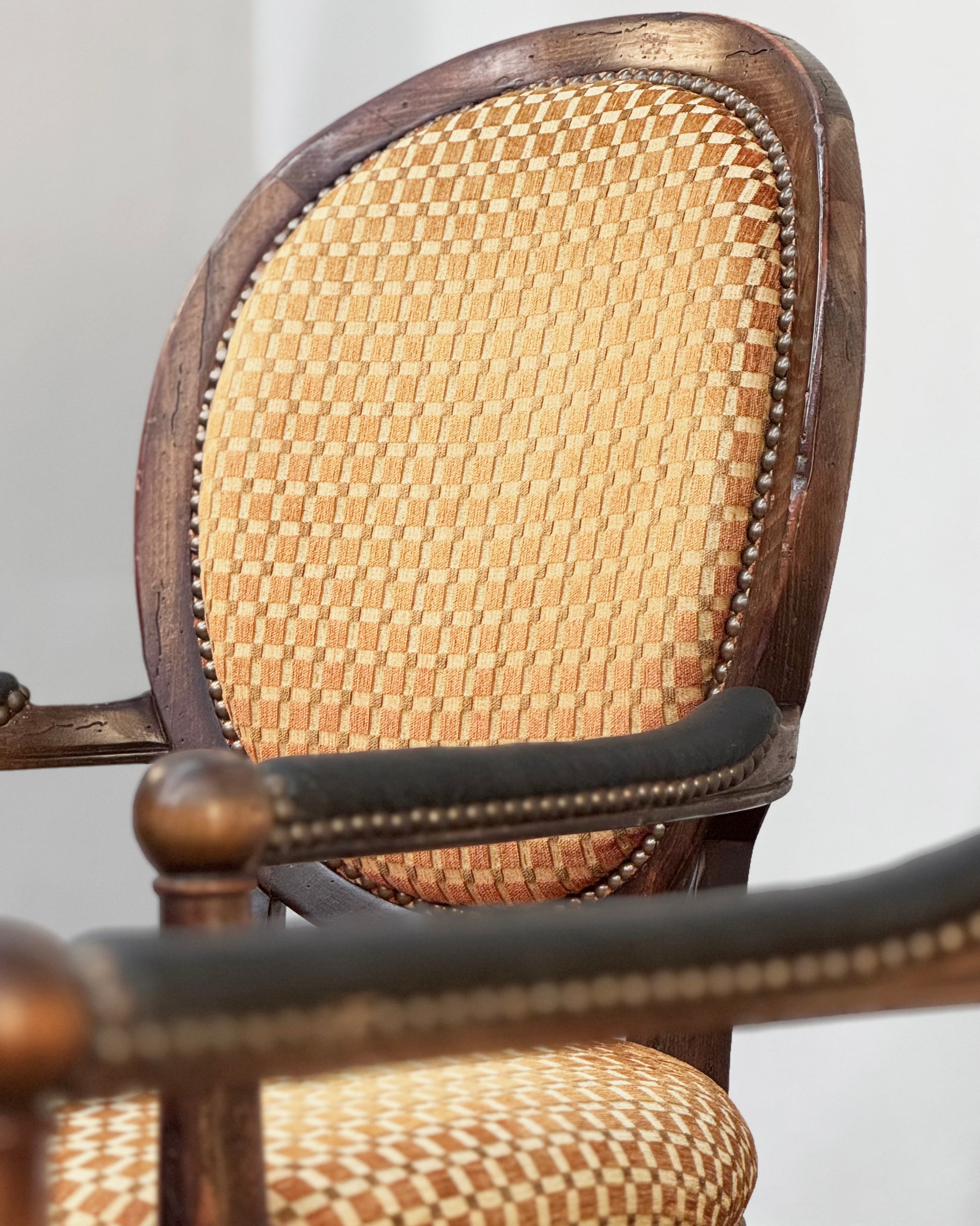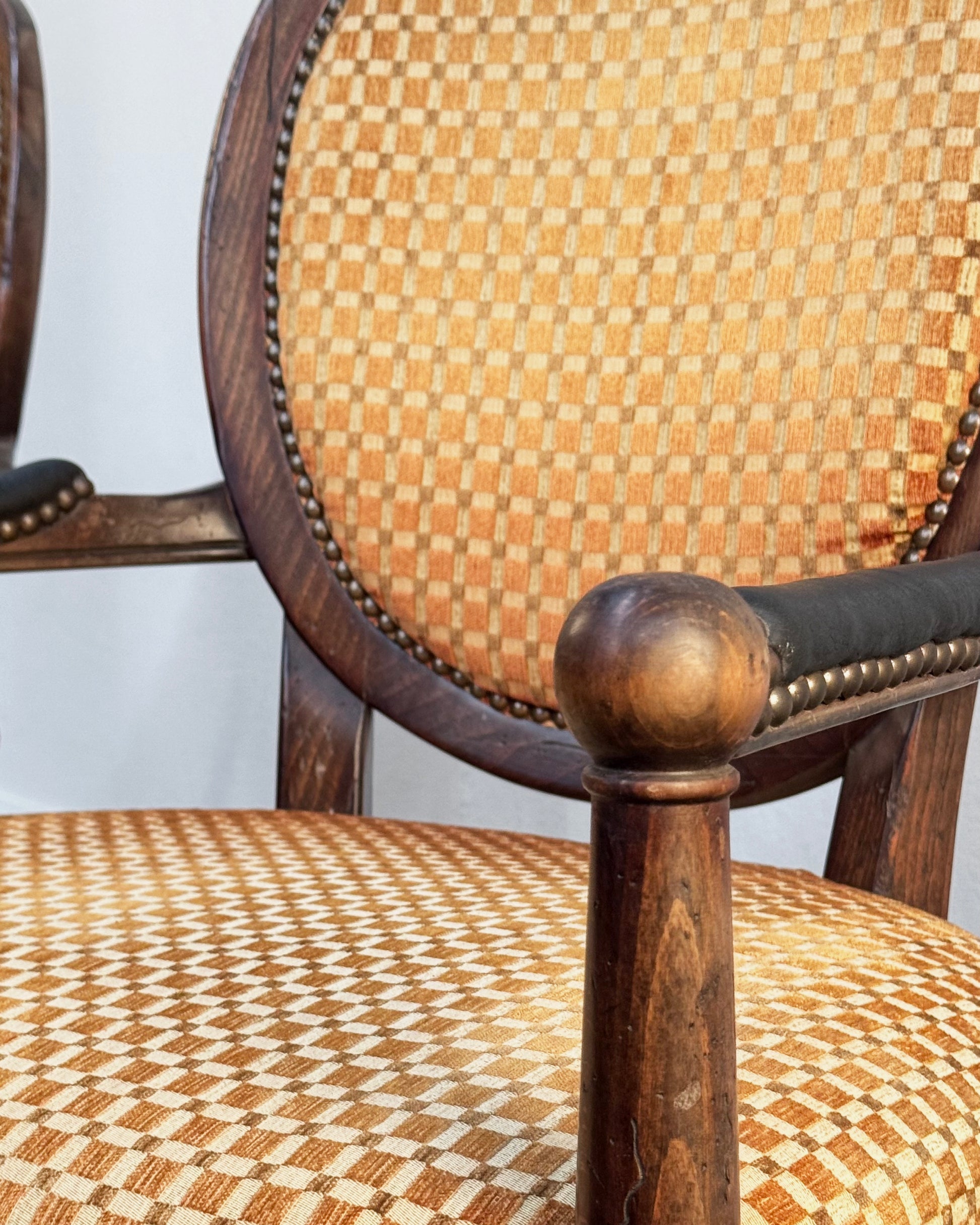 Par de sillas estilo Luis XVI con respaldo ovalado y tapicería recientemente renovada. Estructura elaborada en madera sólida con acabado oscuro y tallado sutil en las patas y marco. Con descansabrazos forrados en piel.