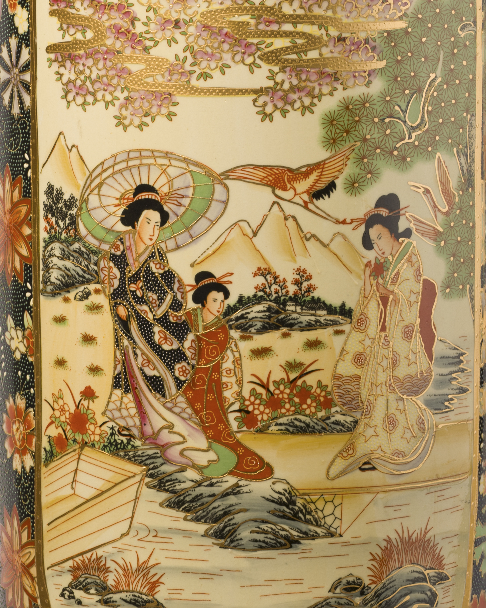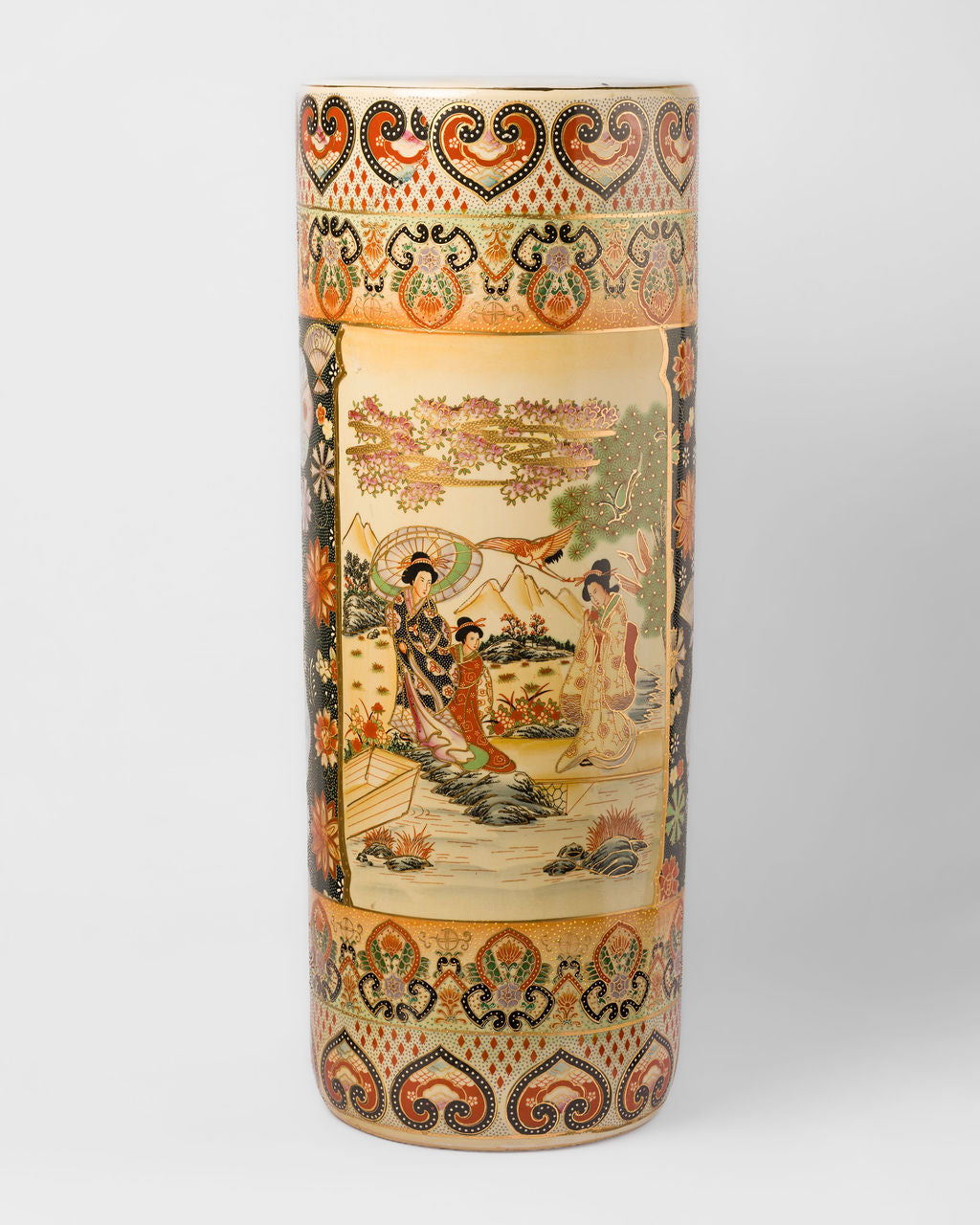 Paragüero de porcelana esmaltada de origen chino, pintado a mano, decorado con escenas orientales enmarcadas por motivos florales y geométricos. Con decoración dorada con relieve, típica del estilo Satsuma, que realza la riqueza de los detalles y la elegancia de la composición.