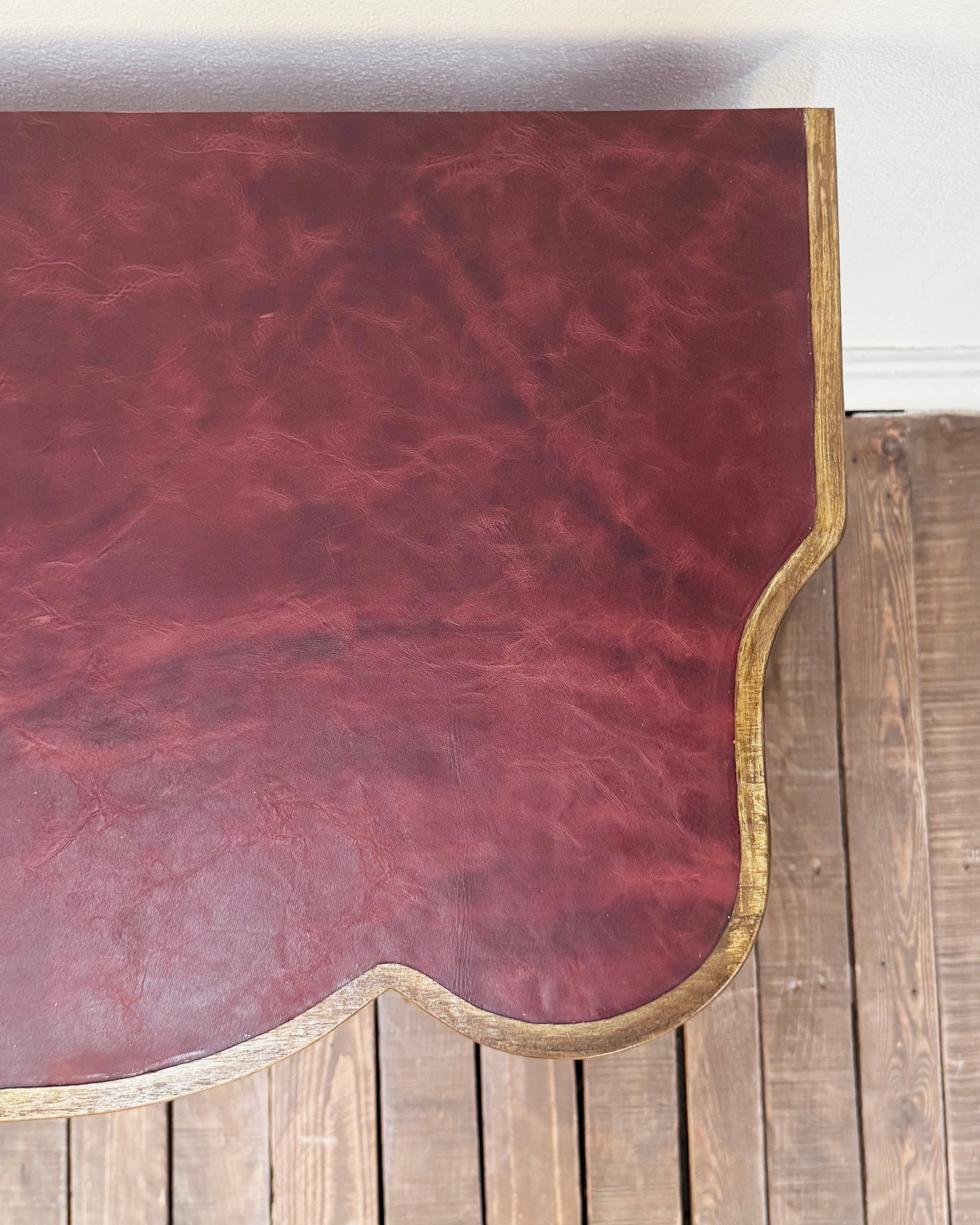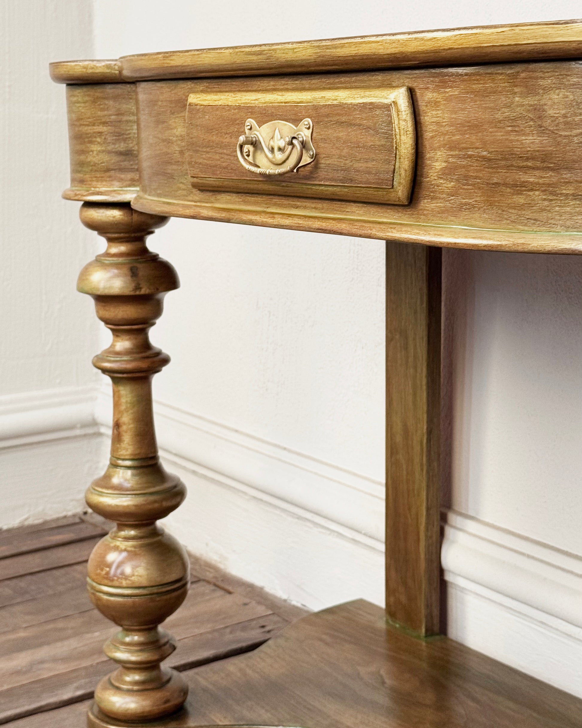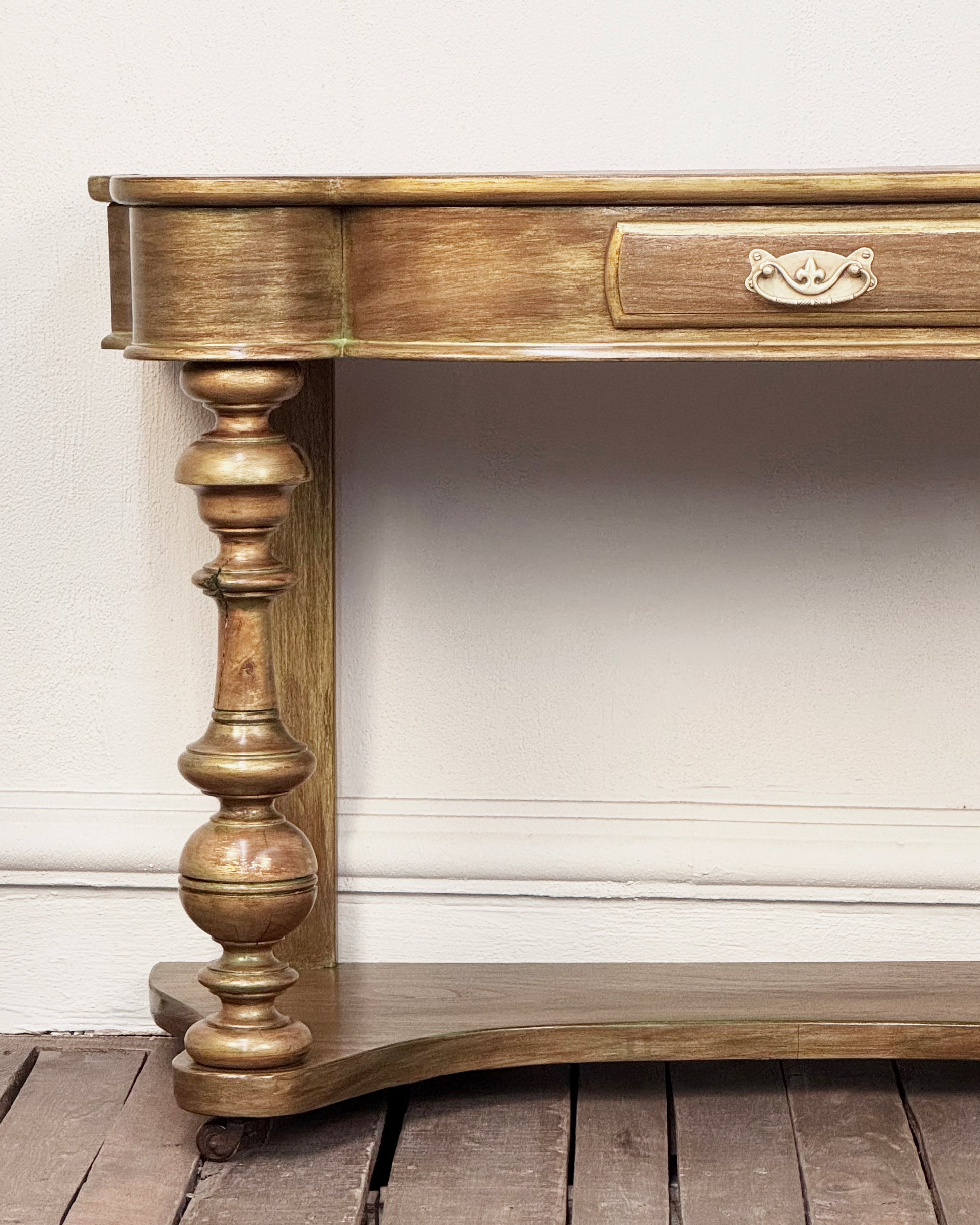 Extraordinaria mesa antigua de finales del siglo XIX. Con acabado en dorado pintado a mano que resalta la belleza de su diseño original clásico. Con cajón y superficie forrada en cuero color vino. Cuenta con una repisa inferior y ruedas de cerámica originales características de la época. Con herraje en bronce dorado.