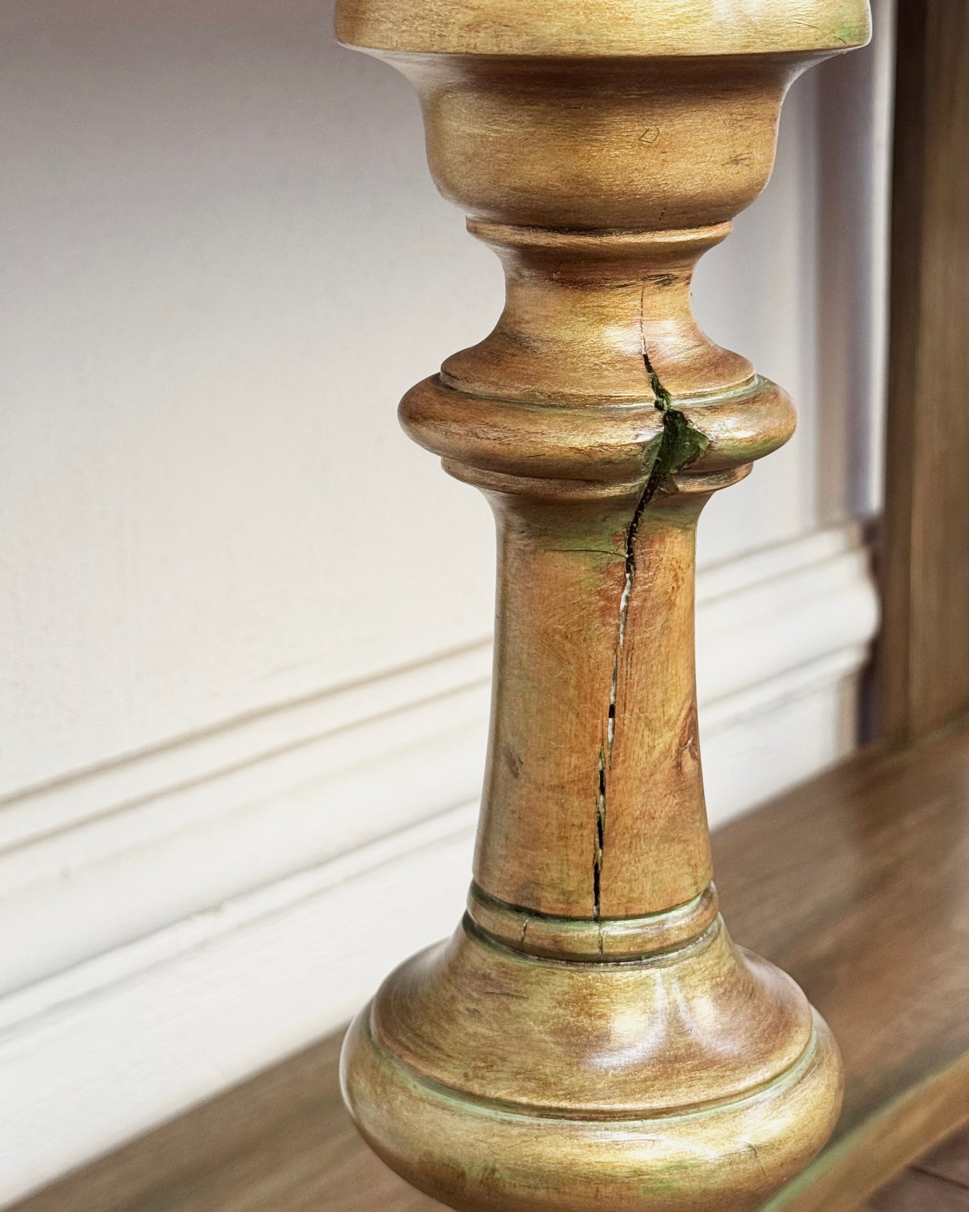 Algunas de nuestras piezas han sido restauradas principalmente de manera estructural para su funcionalidad. Este tipo de desperfectos, como las astillas, grietas y decoloraciones, fueron preservados para dar un acabado envejecido y desgastado, lo que añade profundidad y carácter vintage a estas piezas.