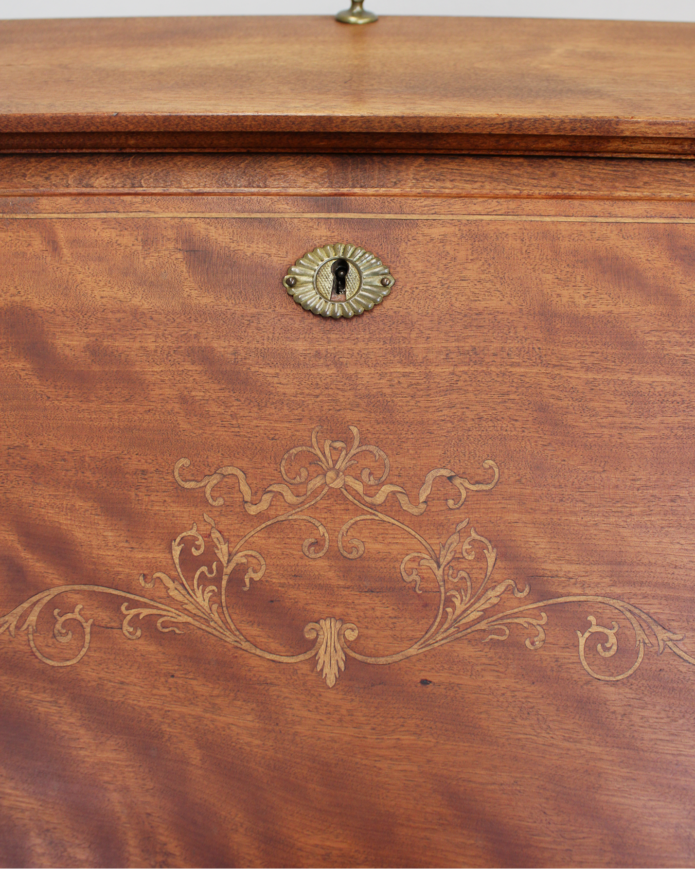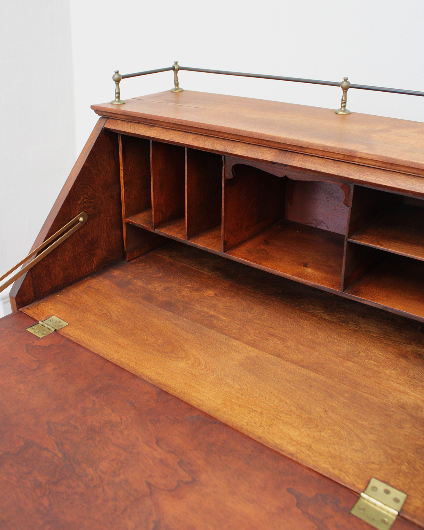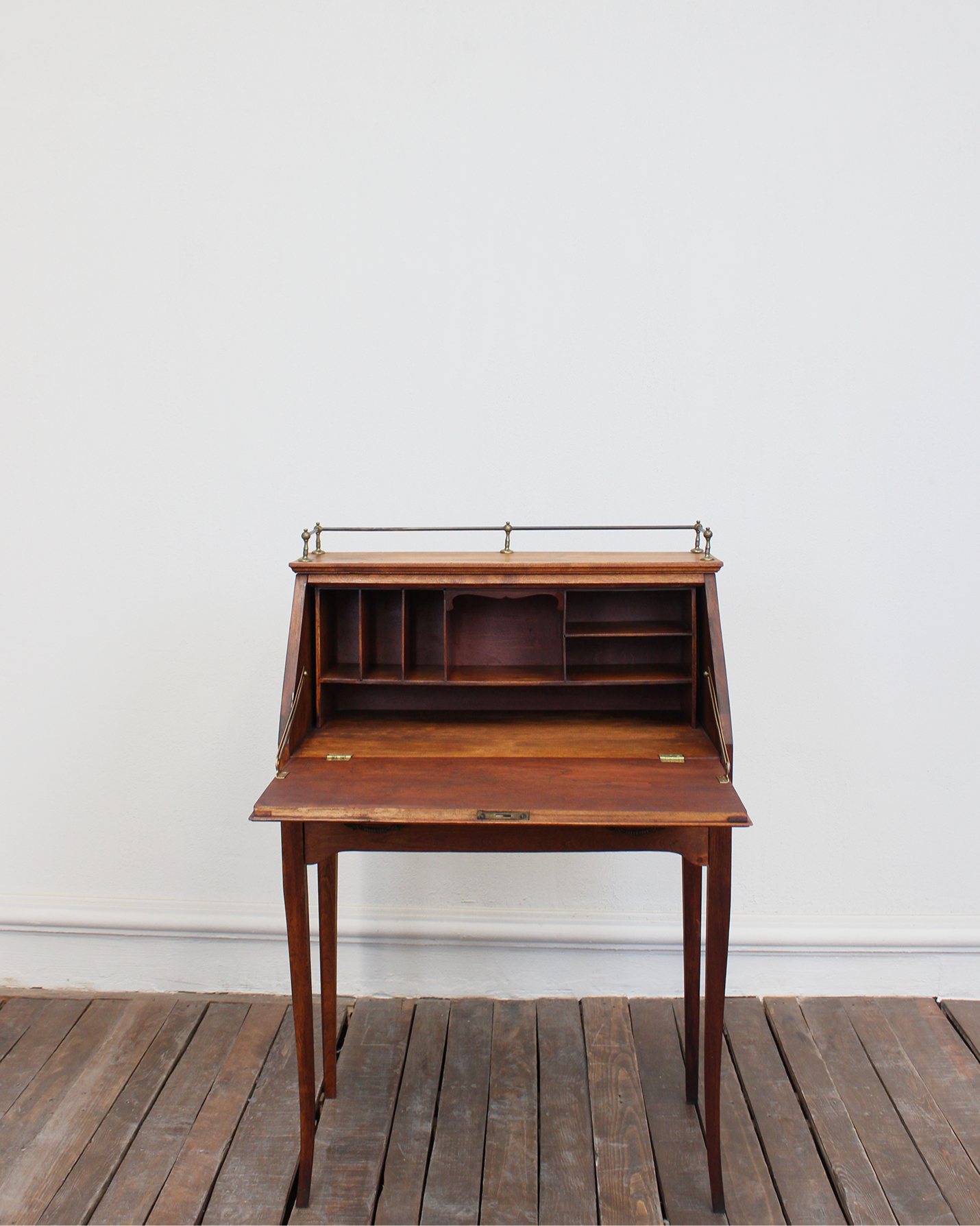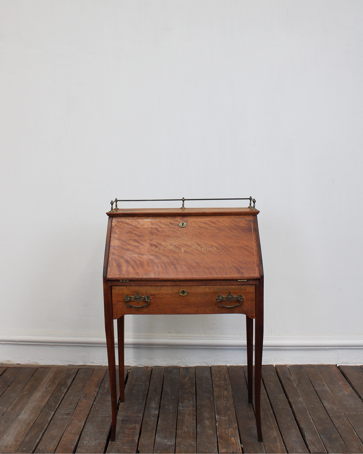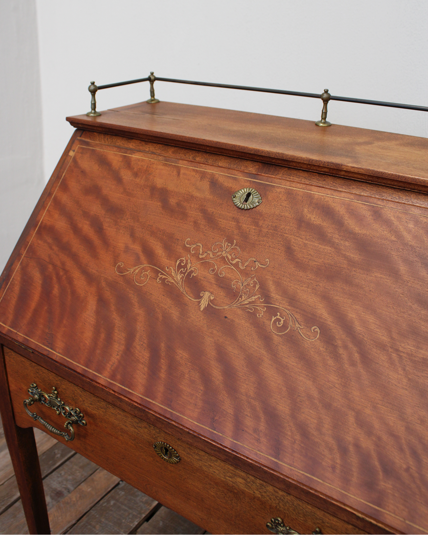 Escritorio tipo secreter, elaborado en madera con marquetería decorativa en forma de moño. Cajón con herrajes de bronce originales y cubierta abatible que revela su función de escritorio. Con barandilla de bronce en la parte superior.