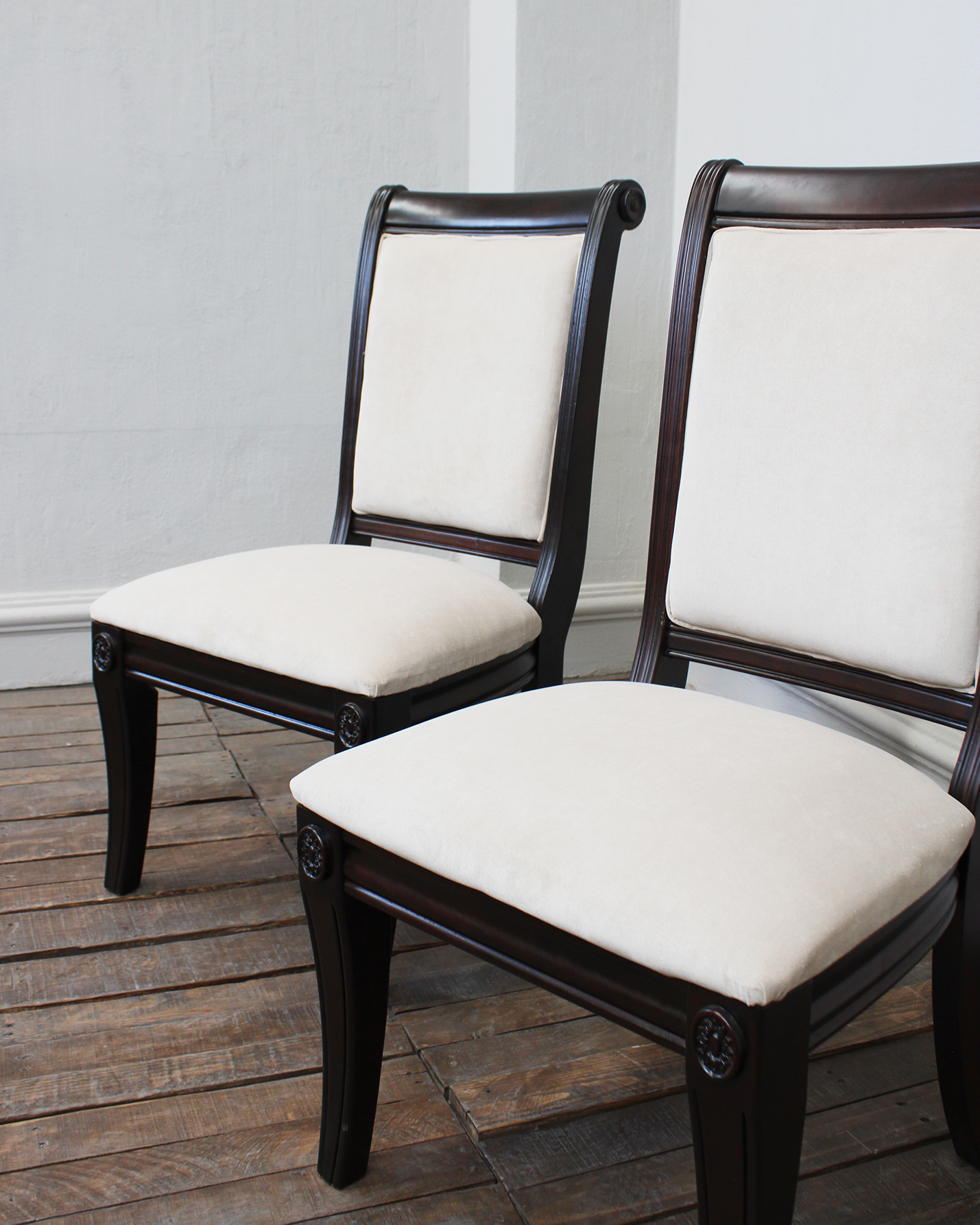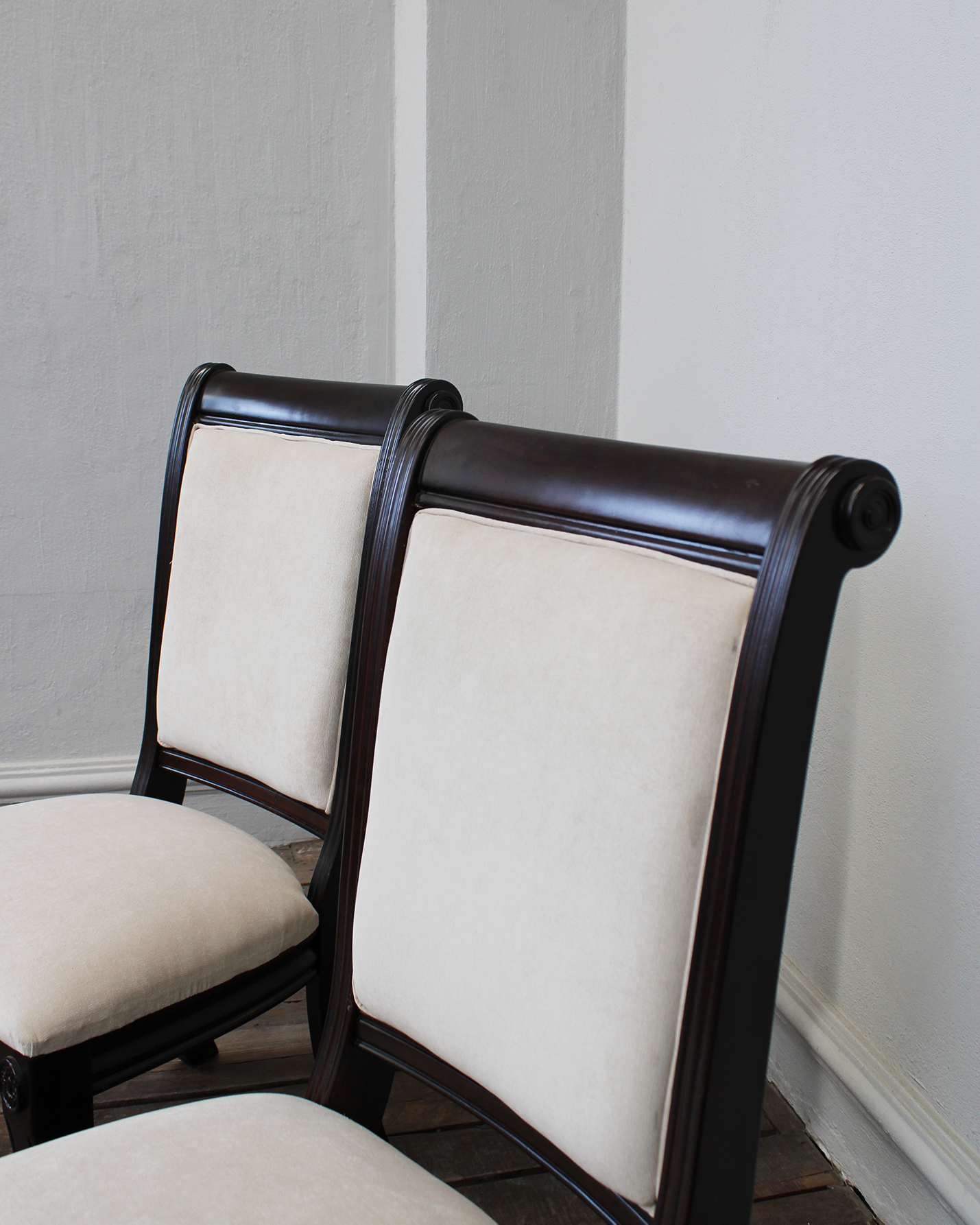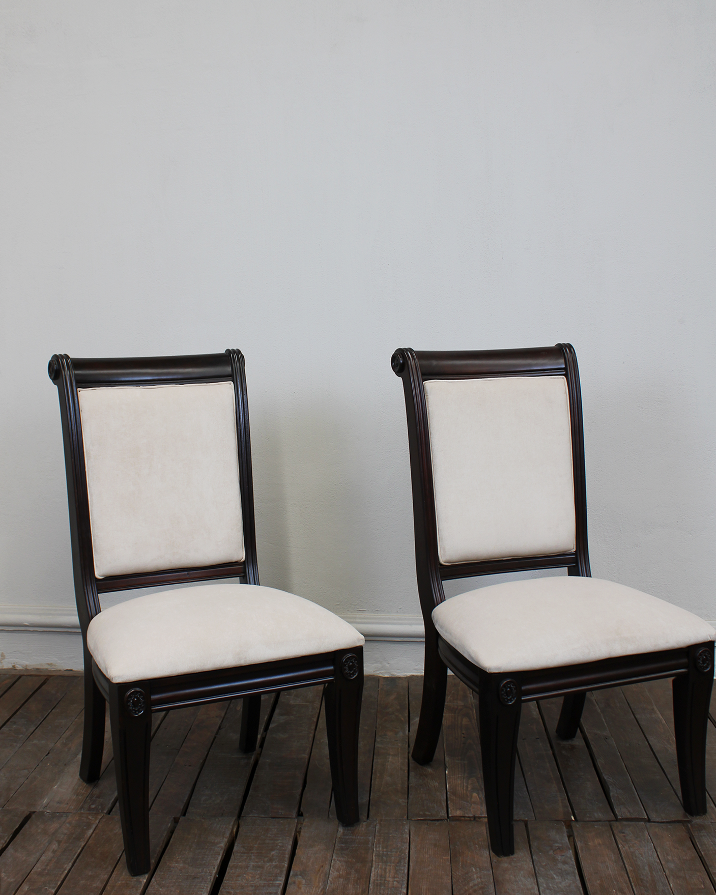 Par de sillas vintage de inspiración Imperio, elaboradas en madera maciza en tono oscuro. Con respaldo recto con ligera curvatura en la parte superior. Asiento y respaldo tapizados en terciopelo beige.