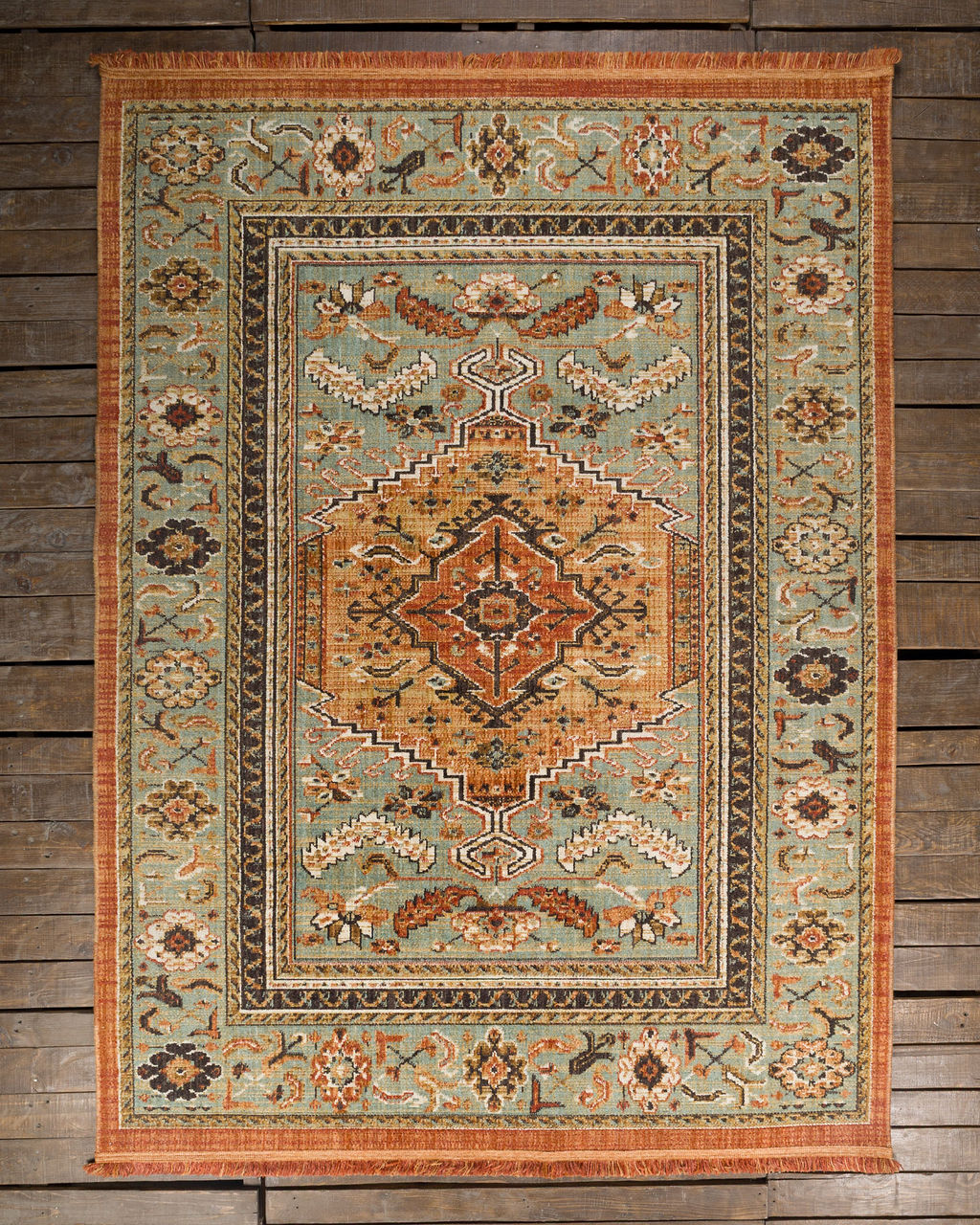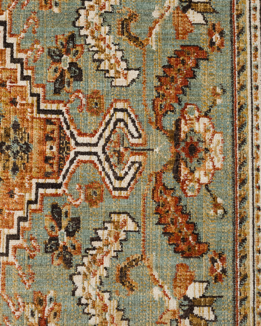 Tapete estilo caucásico realizado en lana sobre urdimbre de algodón. Con medallón central geométrico, bordes escalonados y simetría marcada. Presenta una paleta de colores cálidos donde predominan los tonos terracota, azul verdoso y marfil.
