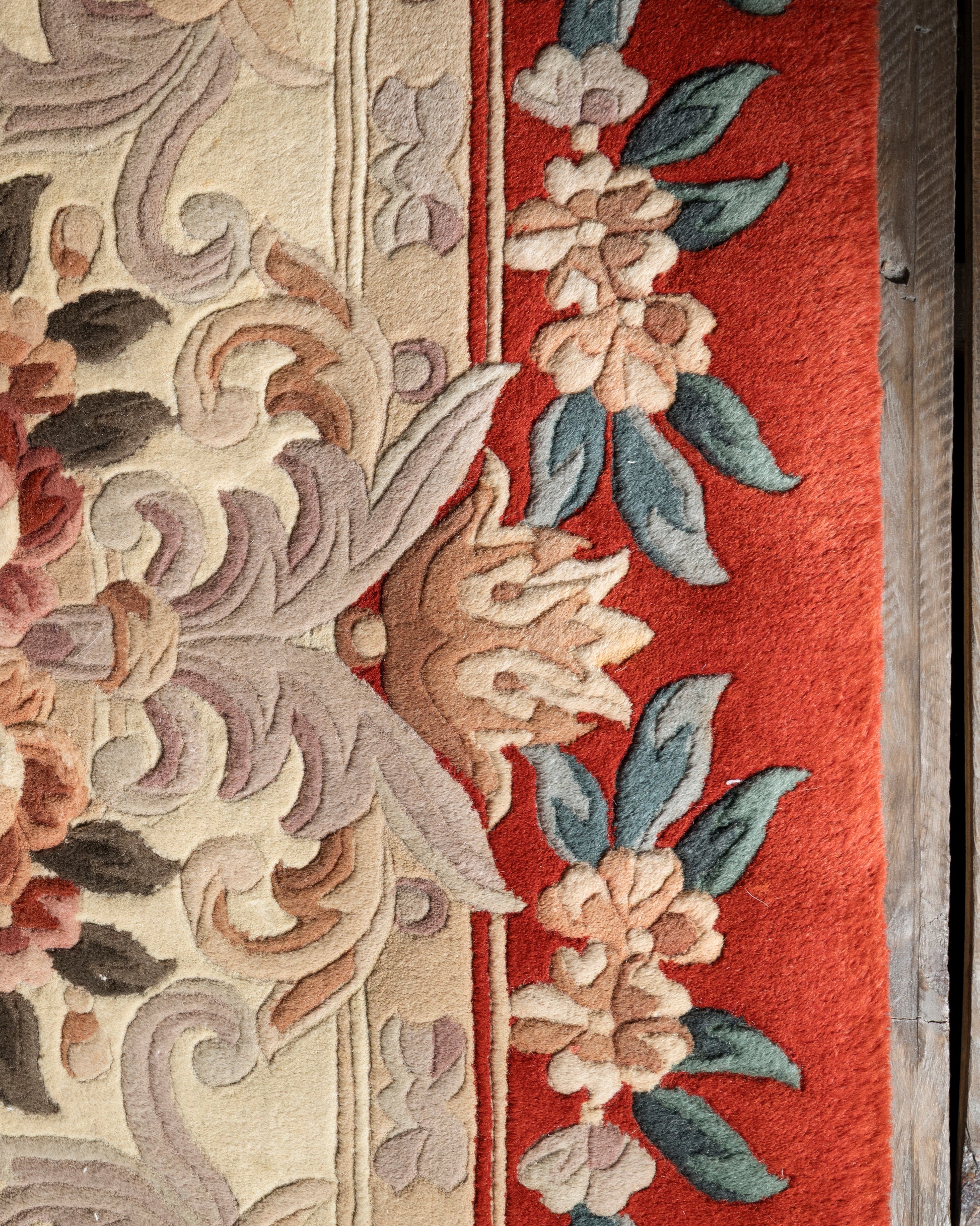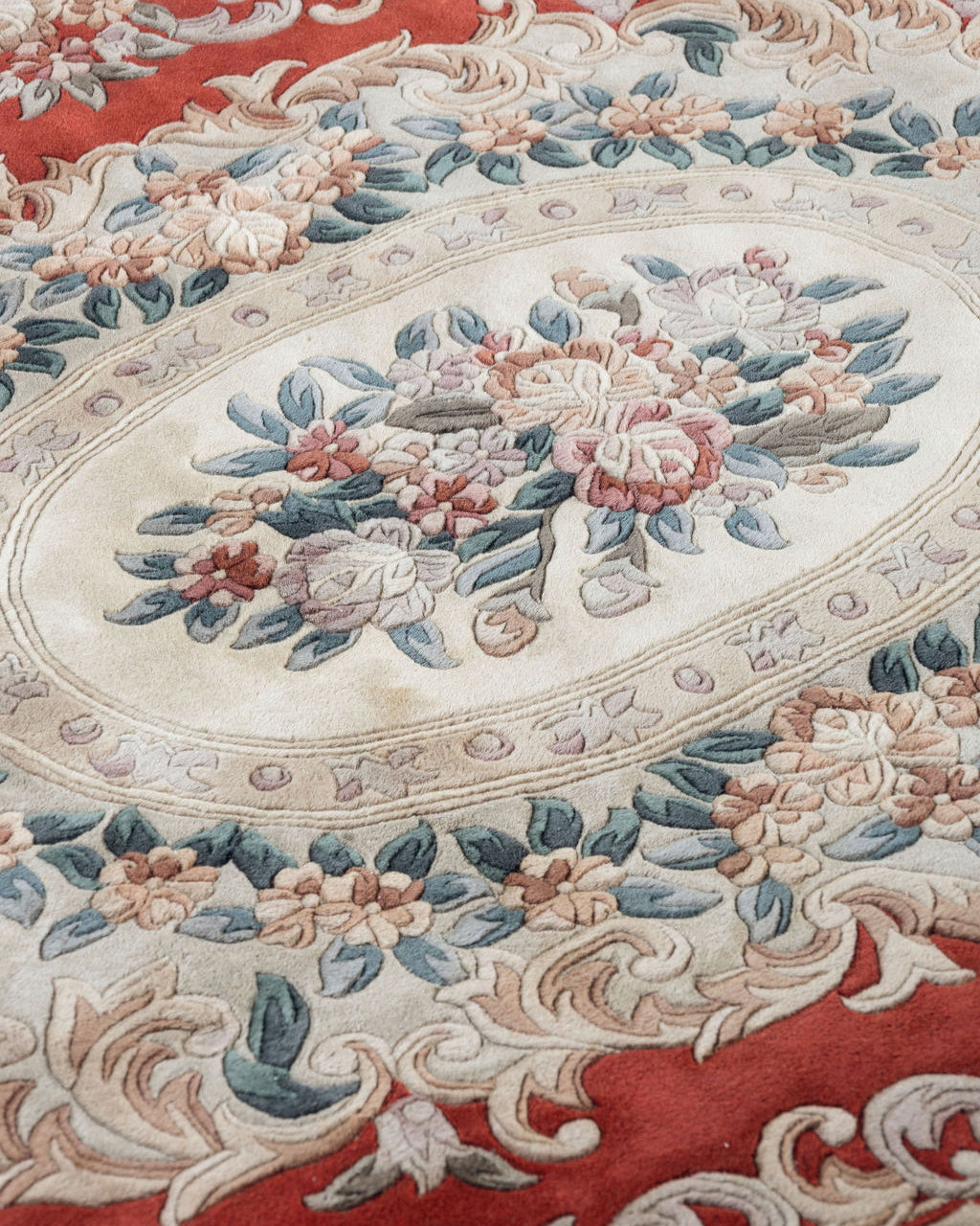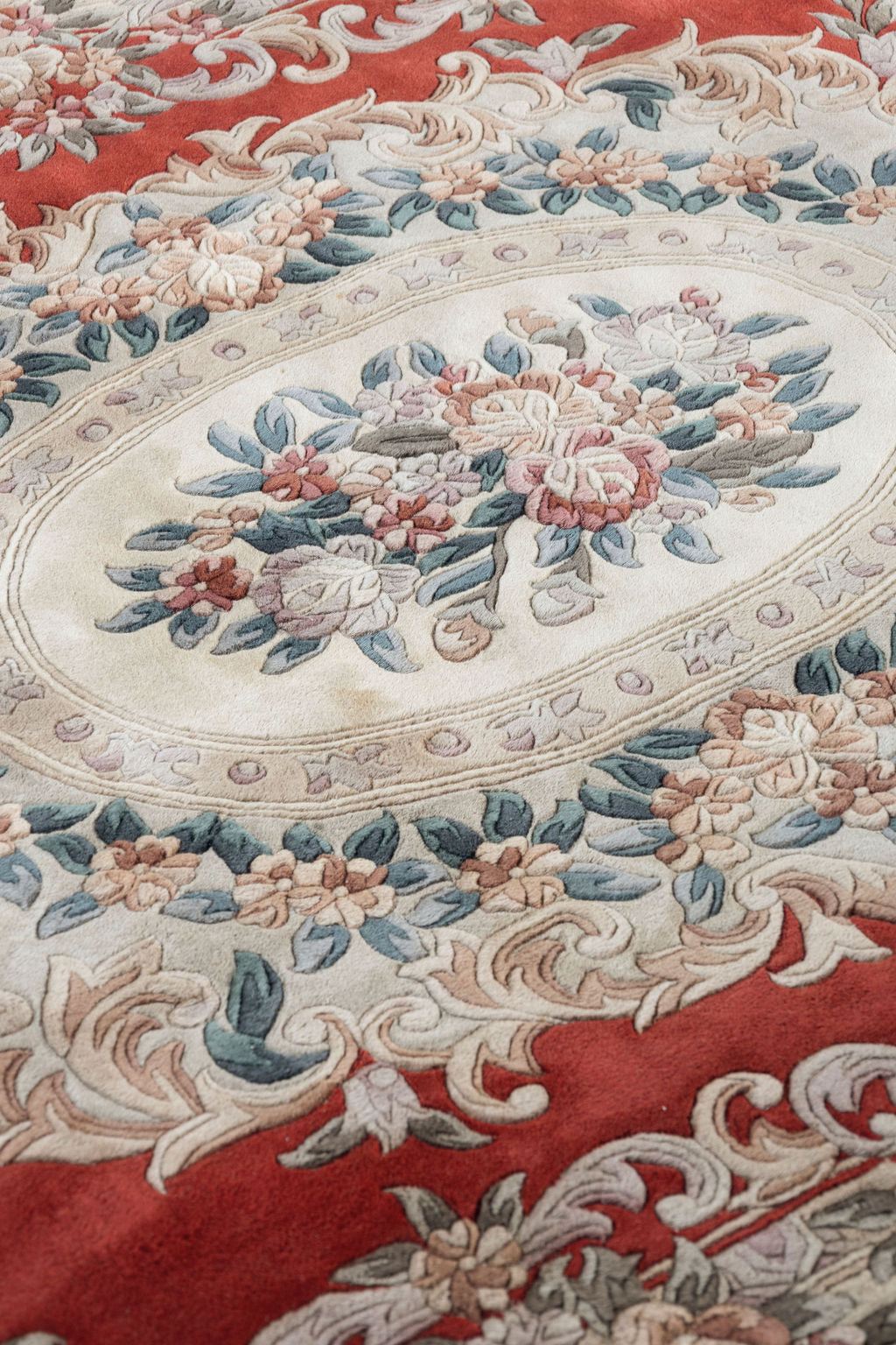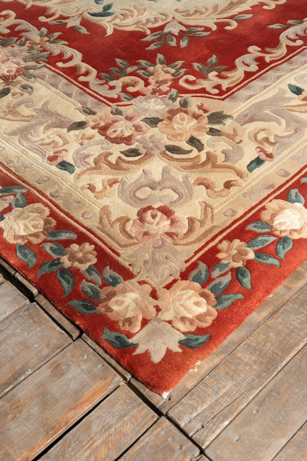 Tapete estilo Savonnerie de gran tamaño originario de Francia. Decorado con medallón central sobre fondo rojo brillante y marfil. Con ornamentos florales y diseño de inspiración europea en tonos rosas, verdes y duraznos aportando calidez y refinamiento a cualquier espacio.