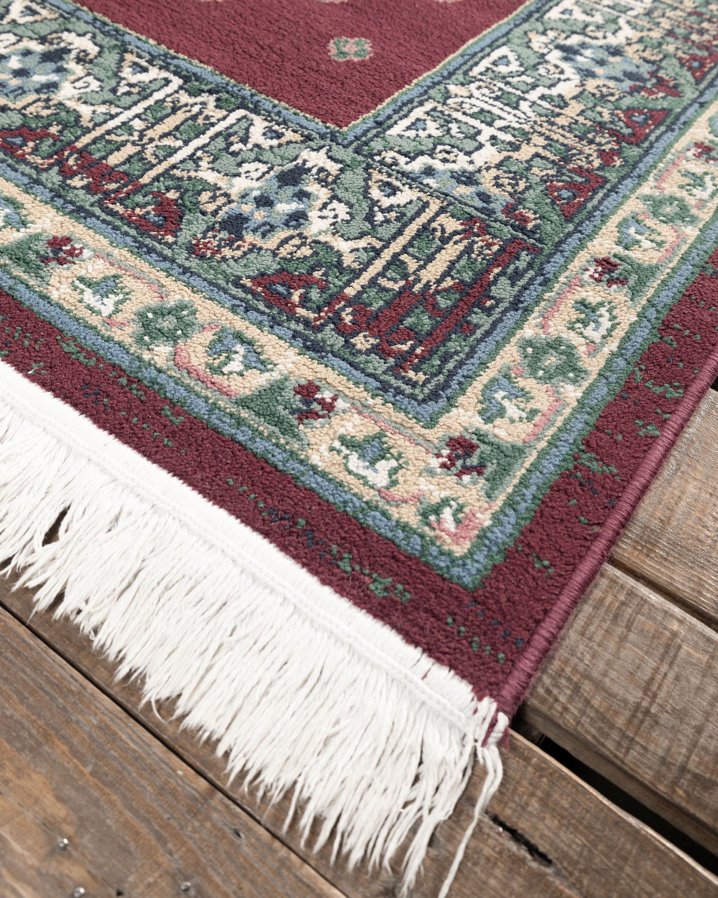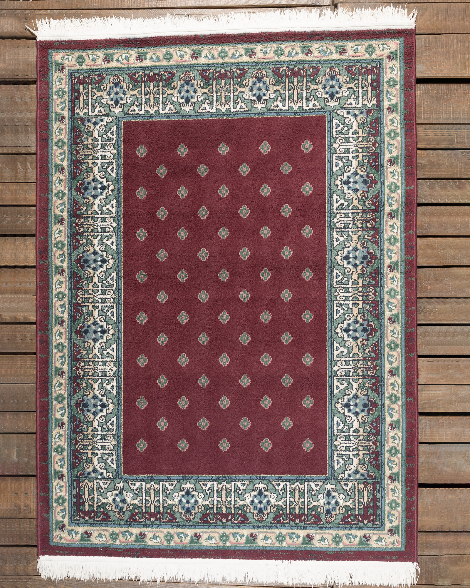 Tapete Perepedil de la región del Cáucaso con fondo color burdeos, decorado con pequeños motivos repetidos distribuidos de forma ordenada. Con cenefa con diseños florales y geométricos en verde, azul y marfil.