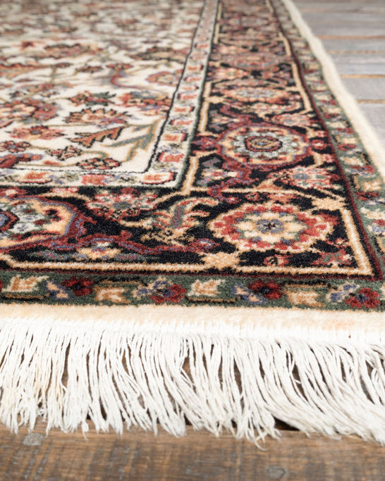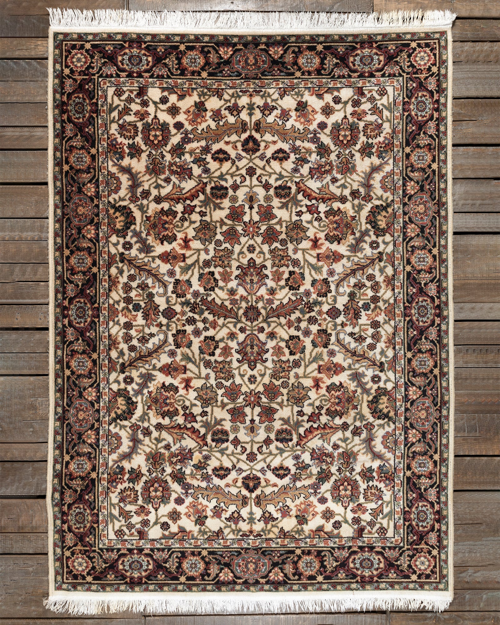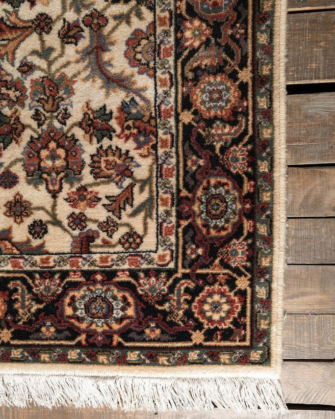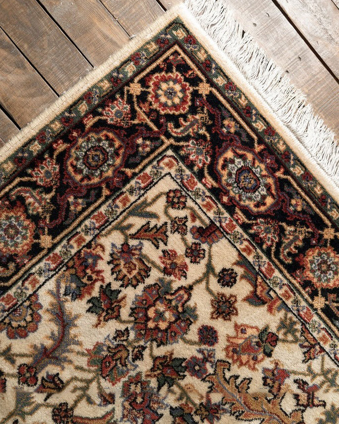Tapete de origen persa, realizado en lana sobre urdimbre de algodón. Con campo simétrico elegante con diseño floral continuo sobre fondo marfil, enmarcado por una cenefa en tonos oscuros. Su patrón repetitivo de flores y hojas estilizadas refleja la tradición de los talleres persas, célebres por su elegancia y precisión ornamental.
