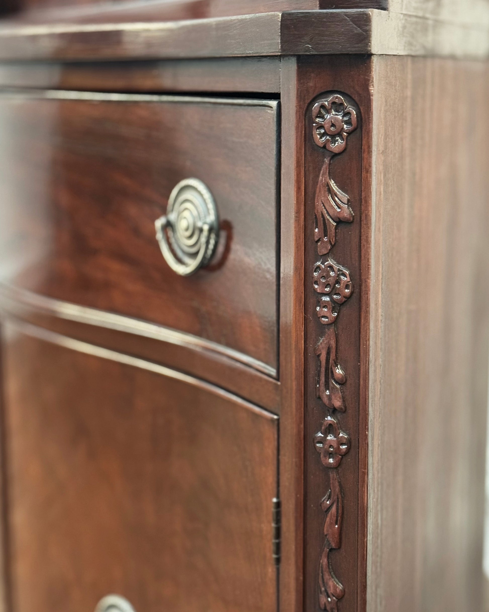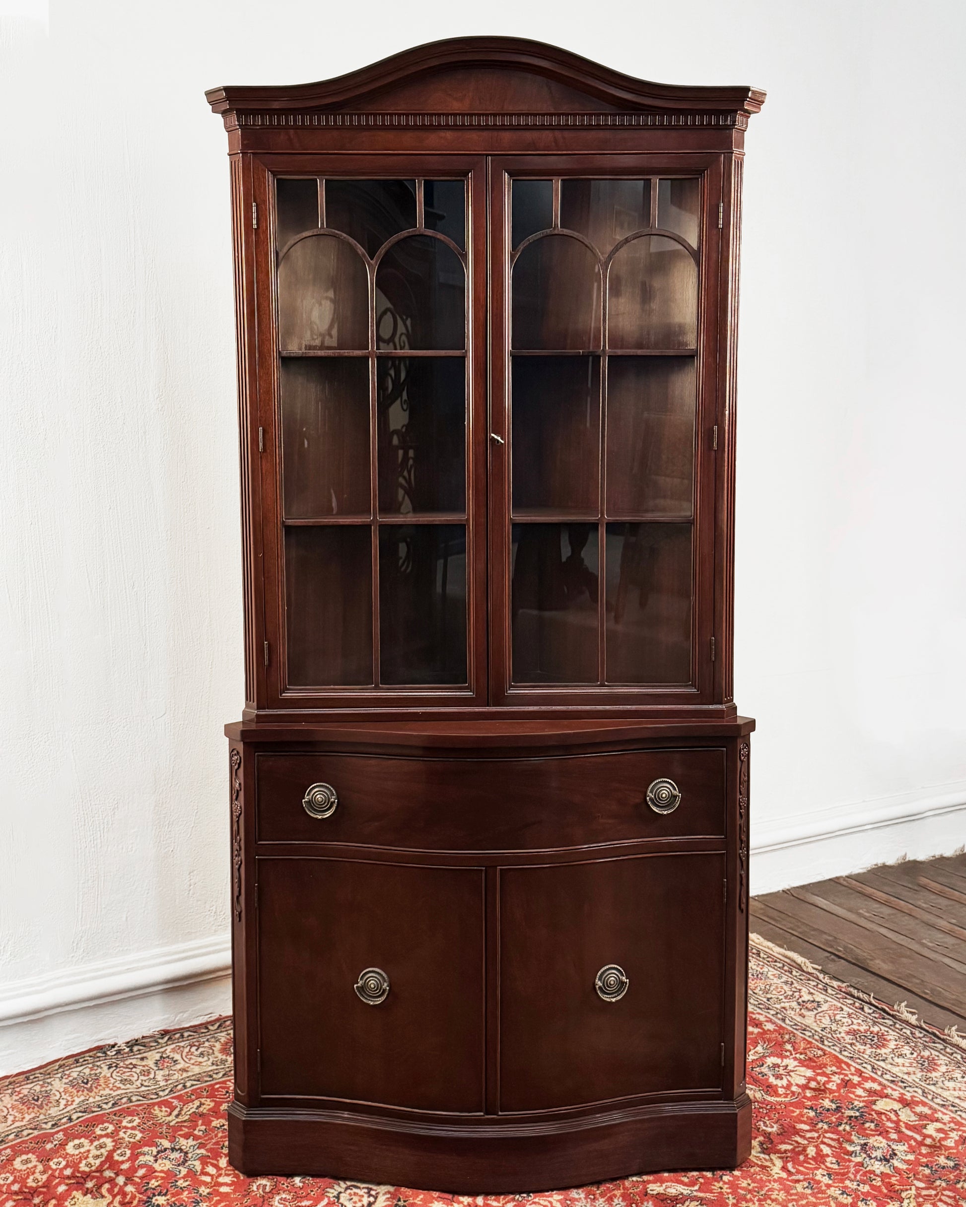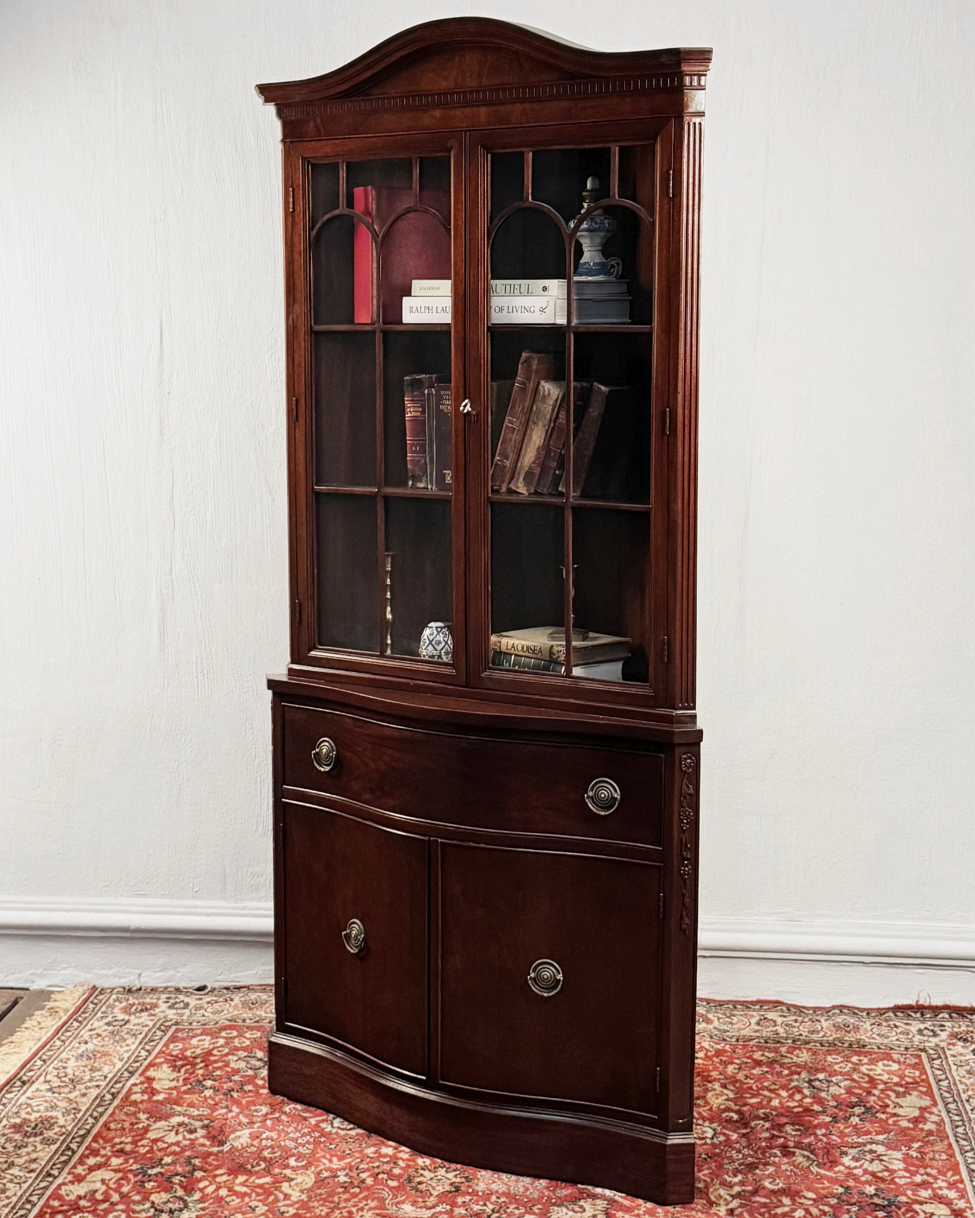 Elegante vitrina vintage esquinera de estilo inglés fabricada en la década de 1930 en madera de caoba. La parte inferior cuenta con cajón intermedio y puertas abatibles. Incluye llave.