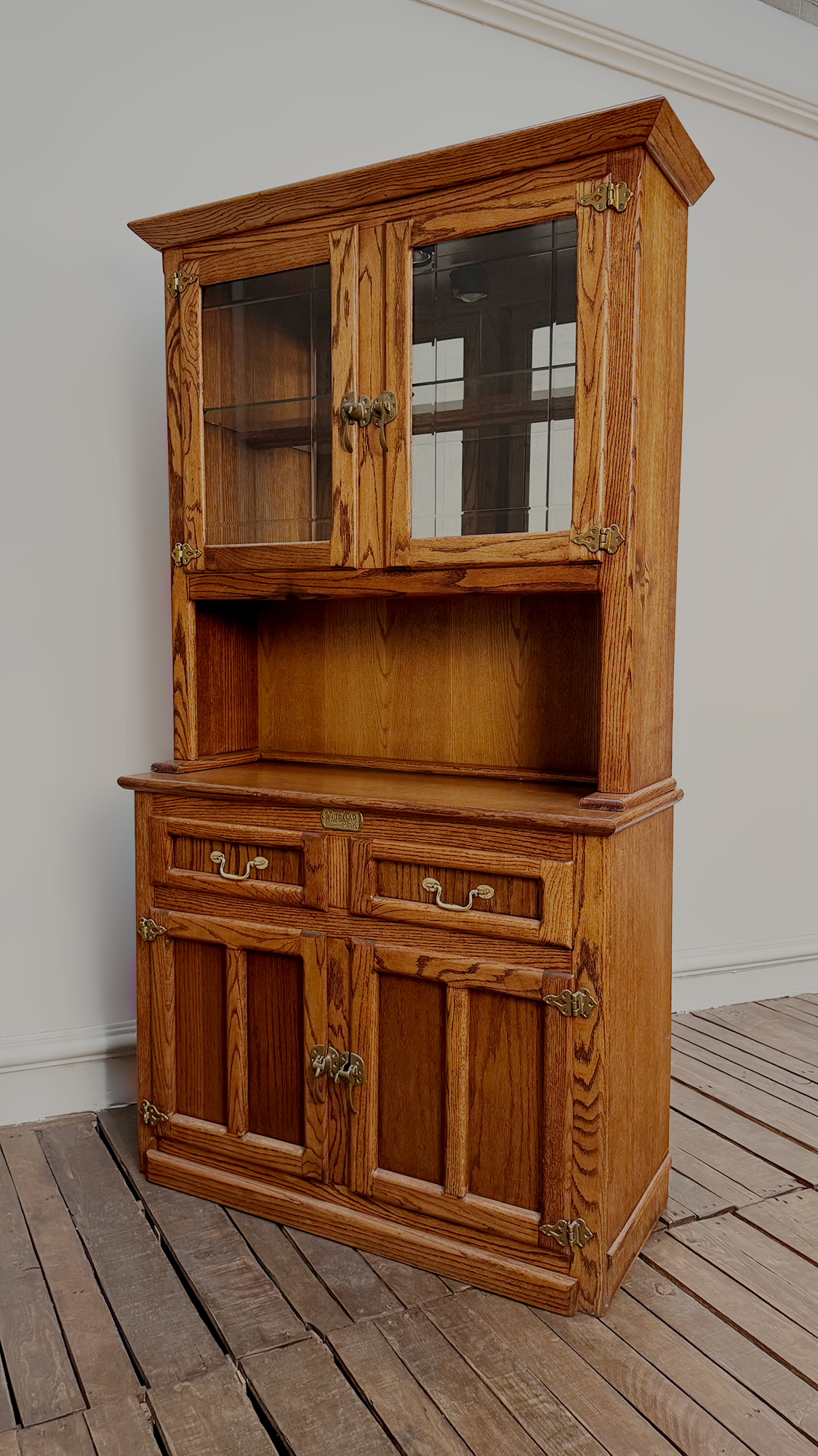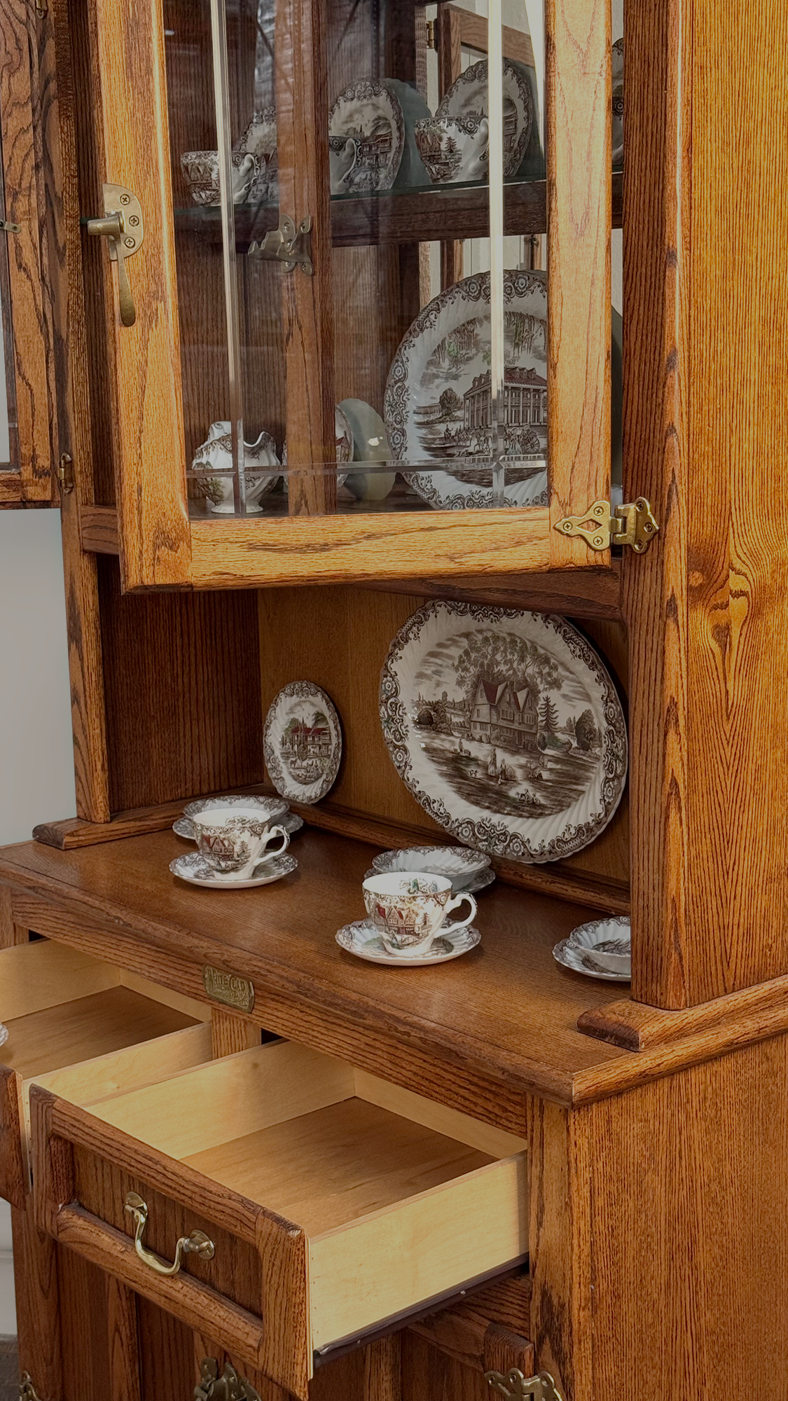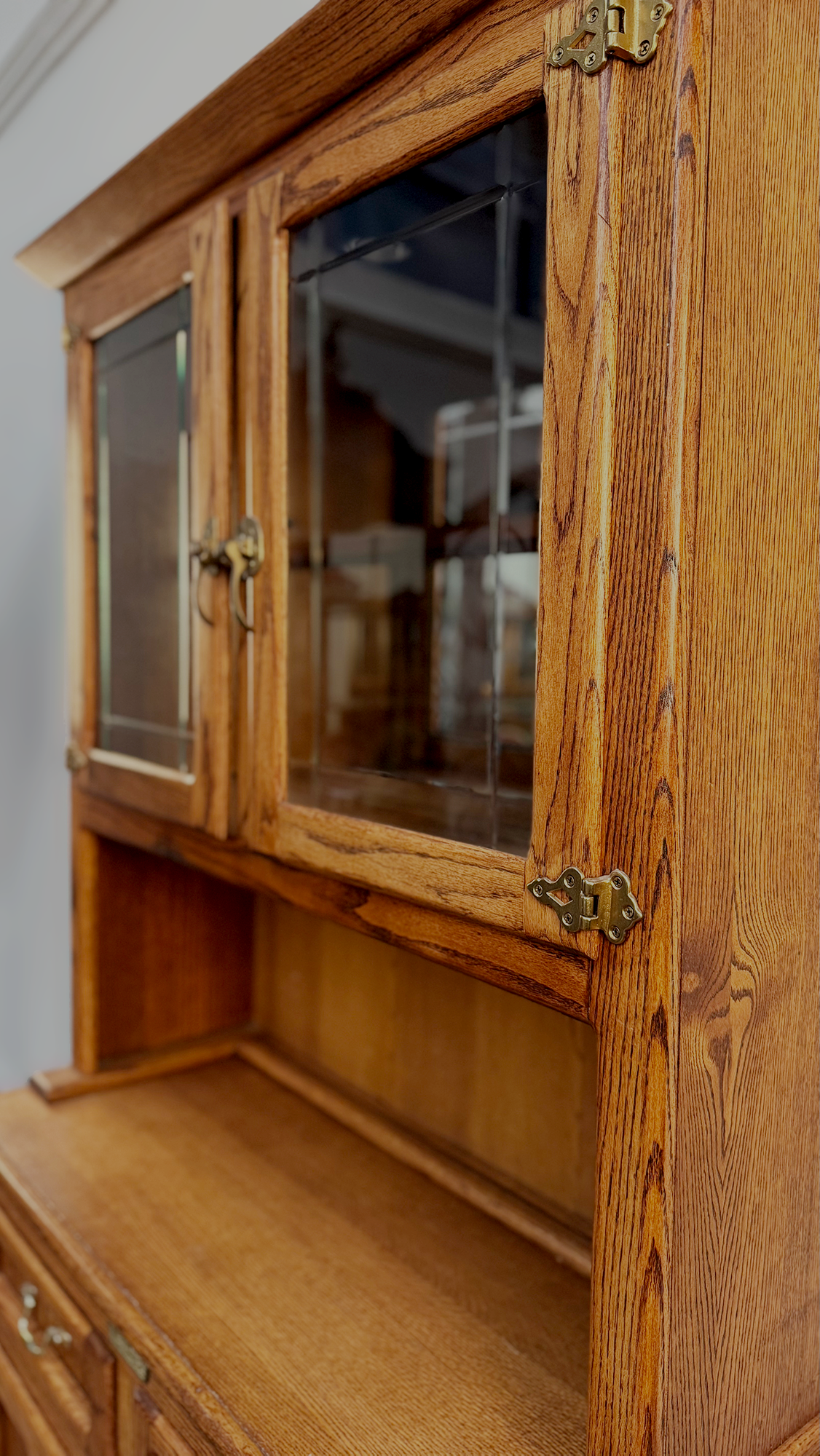 Vitrina/Aparador marca White Clad. Originaria de Estados Unidos fabricada en encino de alta calidad con una estructura sólida y estética cálida con un veteado natural único. La vitrina cuenta con luz interior, puertas de cristal biselado, espejo en el fondo, y espacio para exhibición de platos. Con cerraduras y bisagras de metal dorado en acabado envejecido. La sección inferior cuenta con repisa interior para almacenamiento adicional. Se divide en dos piezas independientes que se sobreponen para facilitar su transporte.