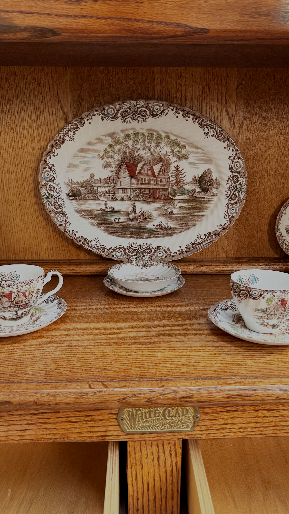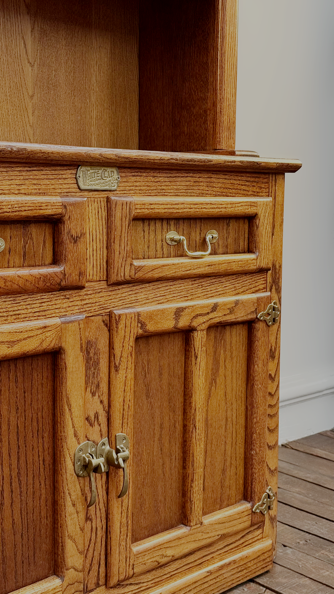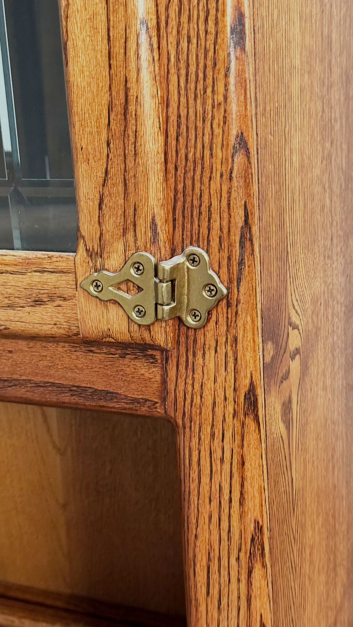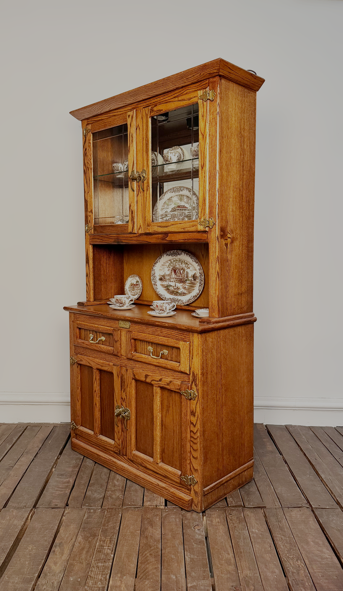 Vitrina/Aparador marca White Clad. Originaria de Estados Unidos fabricada en encino de alta calidad con una estructura sólida y estética cálida con un veteado natural único. La vitrina cuenta con luz interior, puertas de cristal biselado, espejo en el fondo, y espacio para exhibición de platos. Con cerraduras y bisagras de metal dorado en acabado envejecido. La sección inferior cuenta con repisa interior para almacenamiento adicional. Se divide en dos piezas independientes que se sobreponen para facilitar su transporte.